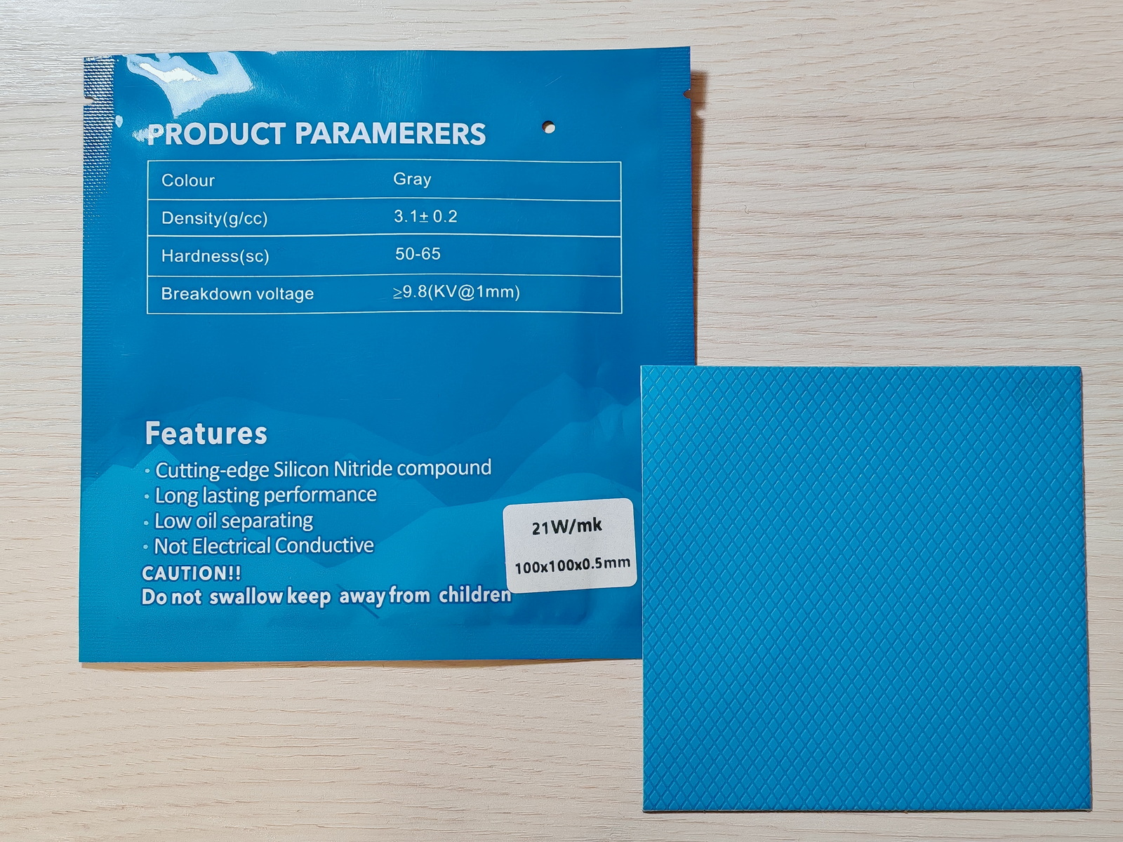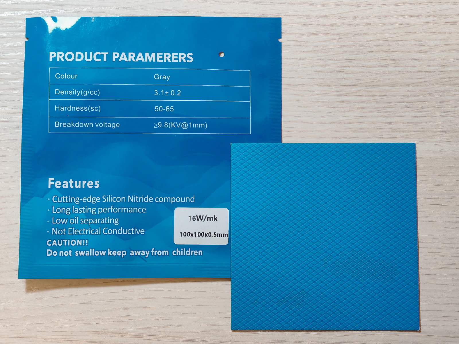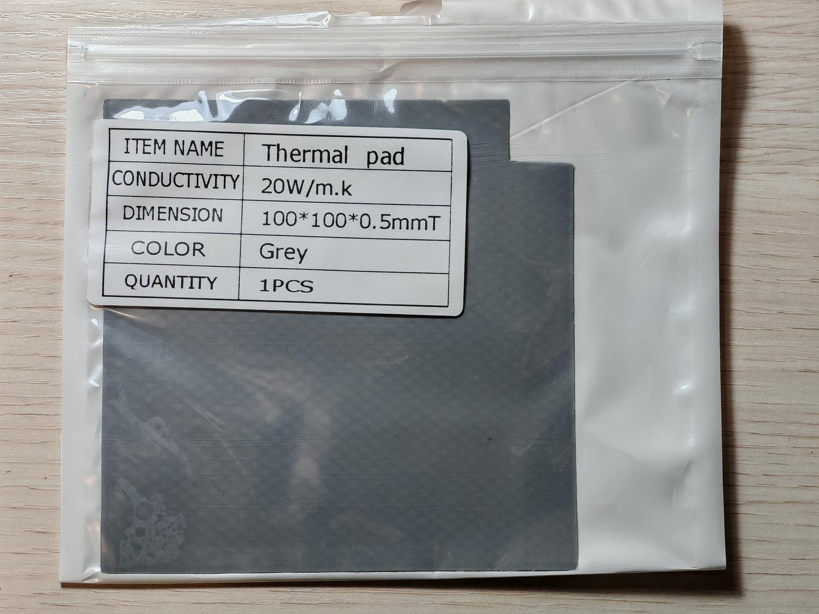 Фабричная упаковка в виде пластикового пакета, внутри прокладка 100×100 мм. Цвет серый, с защитными плёнками с обеих сторон как и полагается. Правда с "косяком" в виде "PRODUCT PARAMERERS" (потому и "негодуют"). Выглядит так. А по делу?