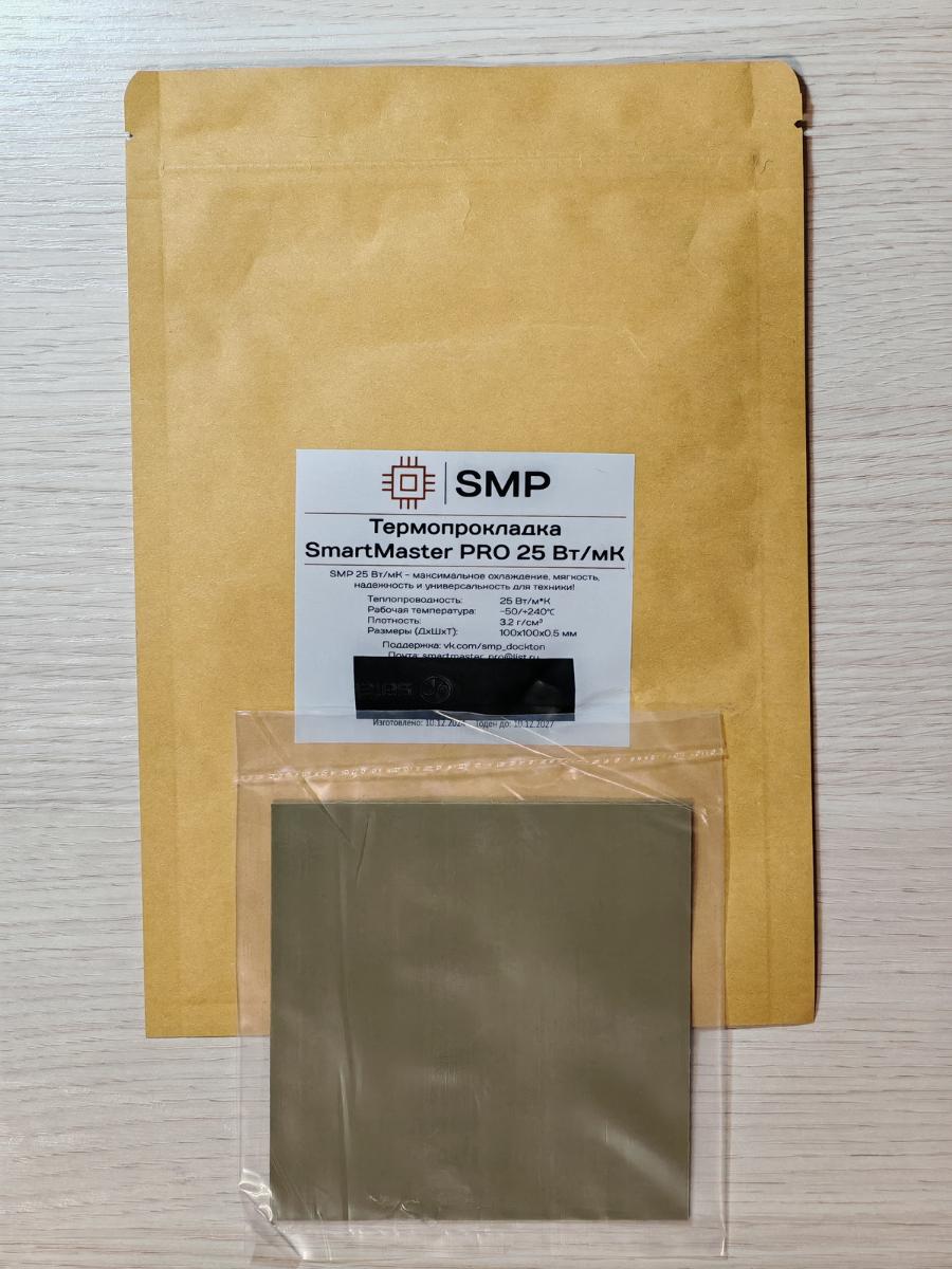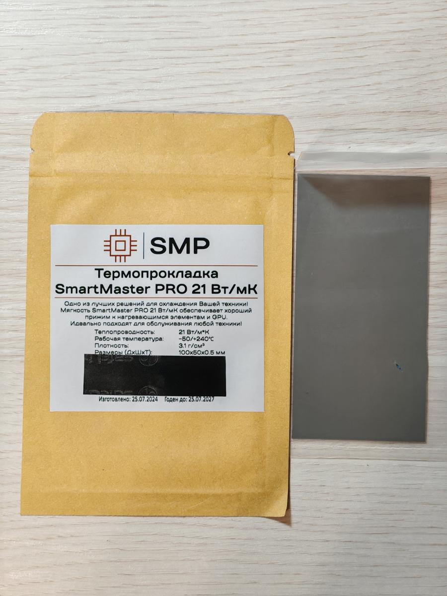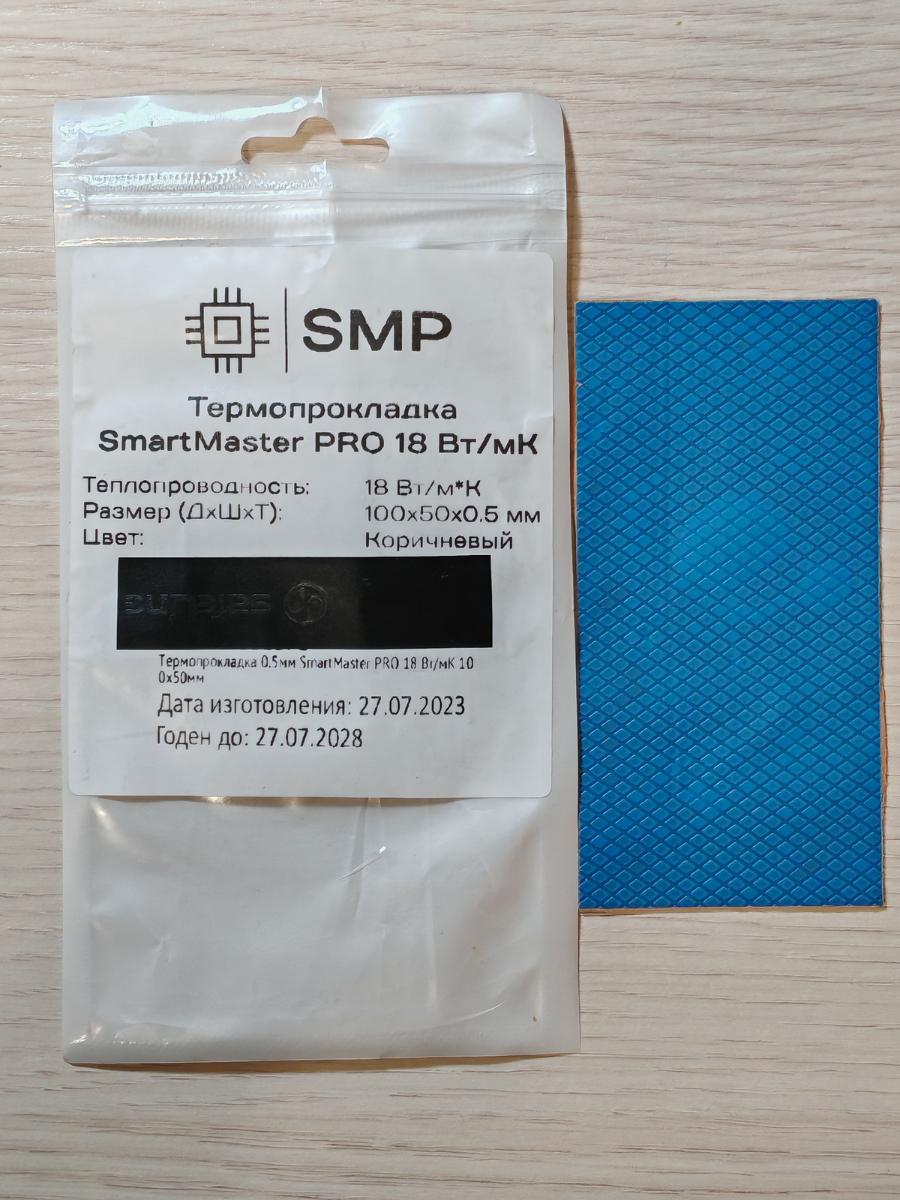 Вот и ещё одна термопрокладка торговой марки SmartMaster PRO. Досталась версия ещё 2023 года, в кустарной упаковке, с термонаклейкой. С обеих сторон синяя плёнка, цвет самой термопрокладки "ржавый".