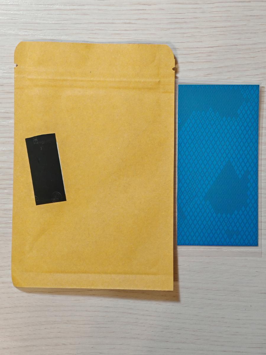 Здесь было решено взять лист 85×45 мм, потому что банально дешевле и в избыточном для подобного тестирования количестве. Здесь заводская упаковка представляет собой пакет из картона, сама прокладка тоже серая (обе защитные плёнки тут цветные), тыльная сторона упаковки без опечаток.