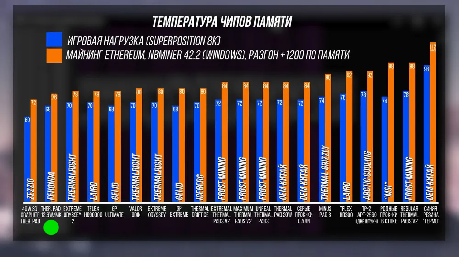 Новый для нашего рынка производитель, на самом деле Shenzhen Feihongda Technology Co. Ltd., его термопрокладки года три назад засветились в видеообзоре авторитетного техноблогера, занимающегося ремонтом и обслуживанием видеокарт. Там имело место тестирование этих термопрокладок в "стандартных" условиях, имея в виду эксплуатацию на чипах видеопамяти под общей системой охлаждения видеокарты MSI RTX 3080 10GB Suprim X. Вот, собственно, его диаграмма: