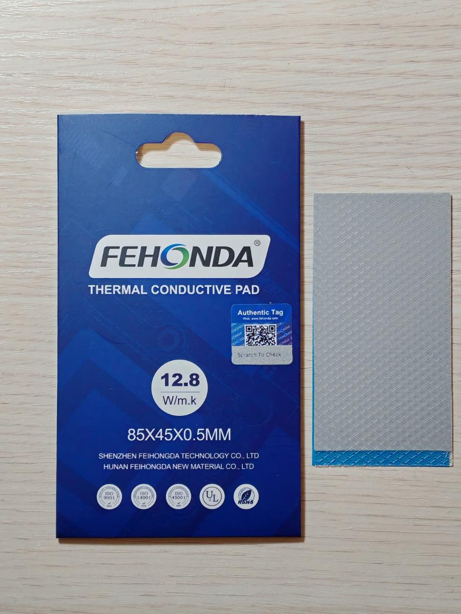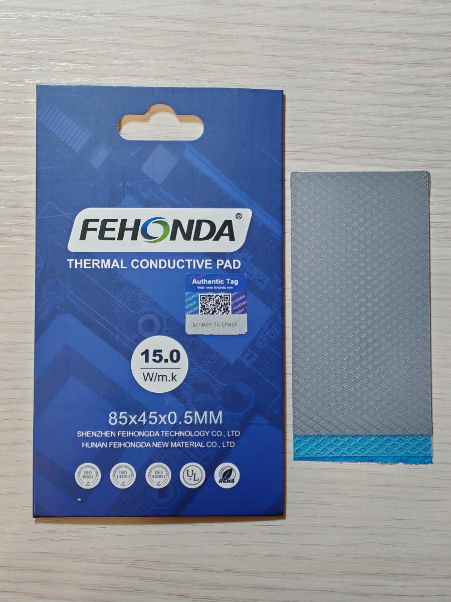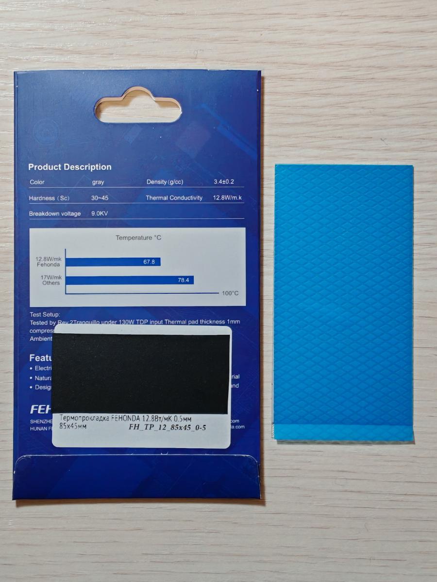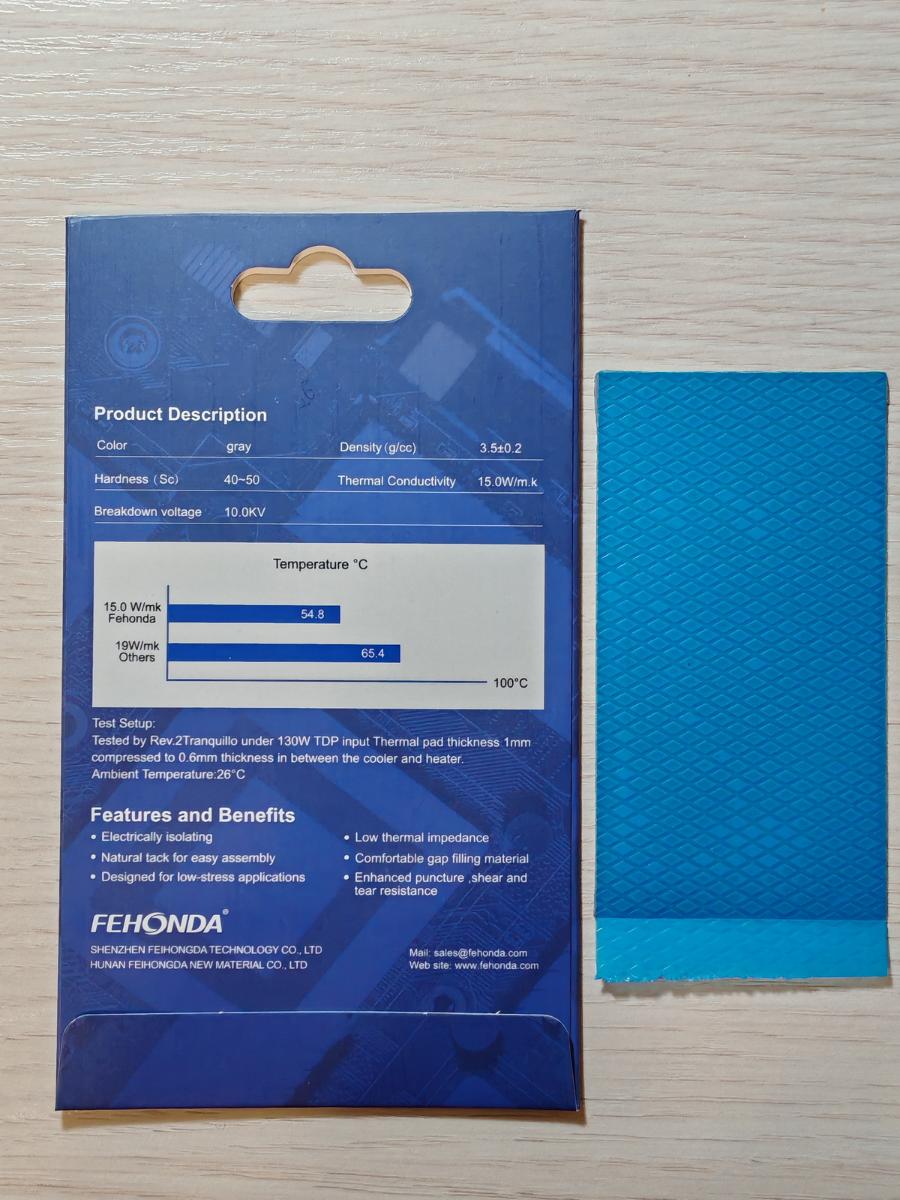 Переходим к "старшей" версии термопрокладок от Fehonda с заявленной теплопроводностью 15.0 W/(m·K). Сходная упаковка в более бледном оформлении, самореклама (с иной диаграммой) тоже на месте, сама прокладка серая, заметно темнее предыдущей, также с двумя защитными плёнками с обеих сторон, как и полагается. Версия на 12.8 W/(m·K) и тут задала планку. А что дальше? Или опять чуда не случится, как и с термопастами?