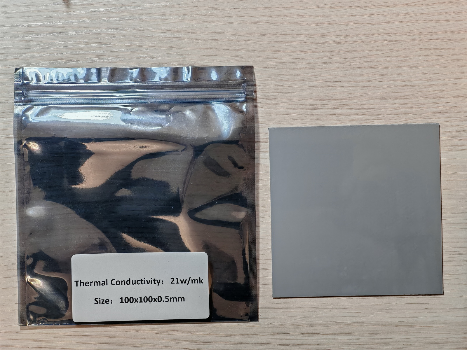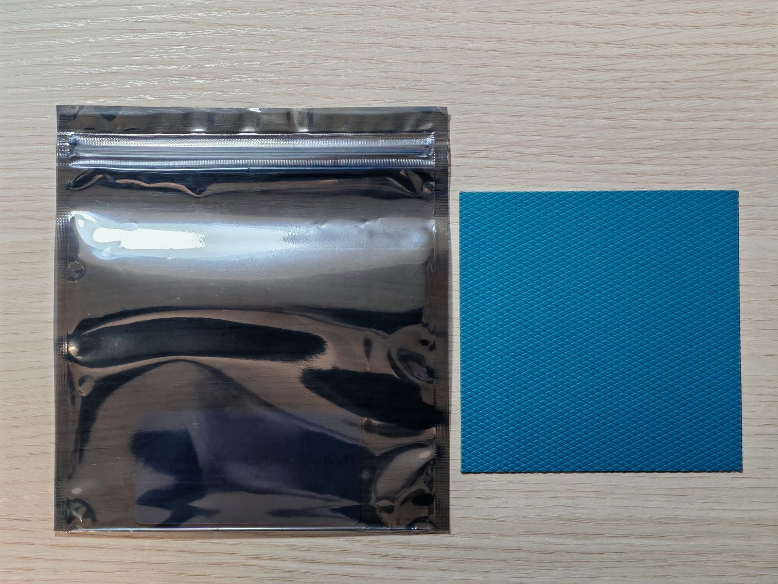 Термопрокладка с более высокой заявленной теплопроводностью имеет стандартный серый цвет, с голубоватым (скорее хромово-стальным) отливом, в похожей фабричной упаковке, на этот раз без дополнительного вложенного пакета.