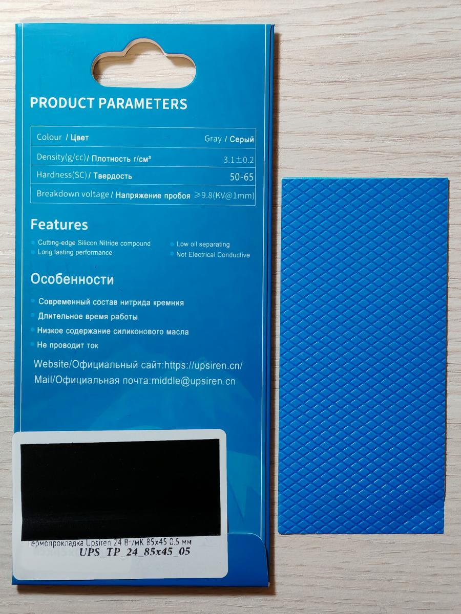 "Всё то же самое" с виду: такая же упаковка, такая же орфографическая ошибка на тыльной стороне. Ну, может быть, несколько иной оттенок серого у самой термопрокладки, и сама она значительно более жёсткая на изгиб и упругая на сжатие. Что она покажет?