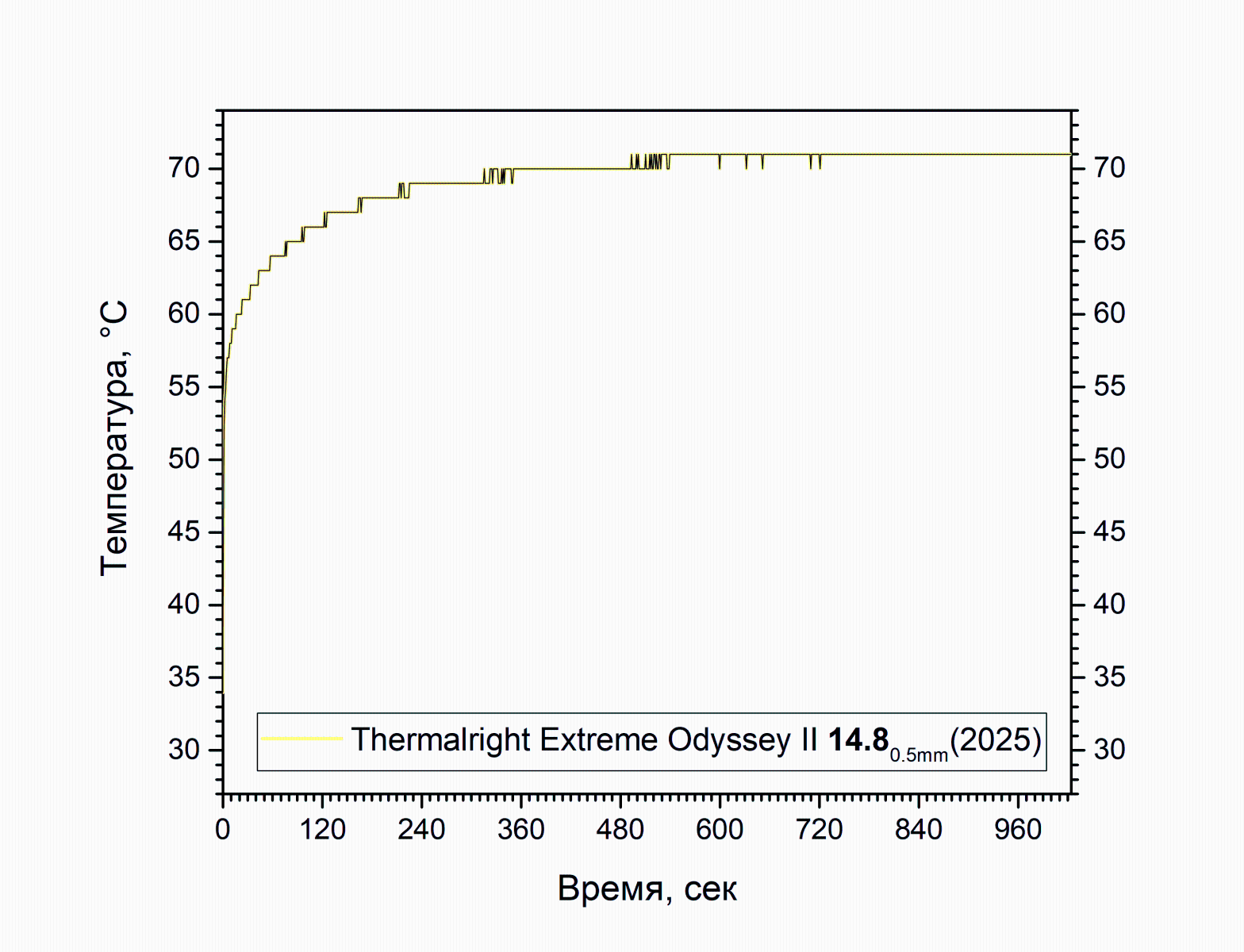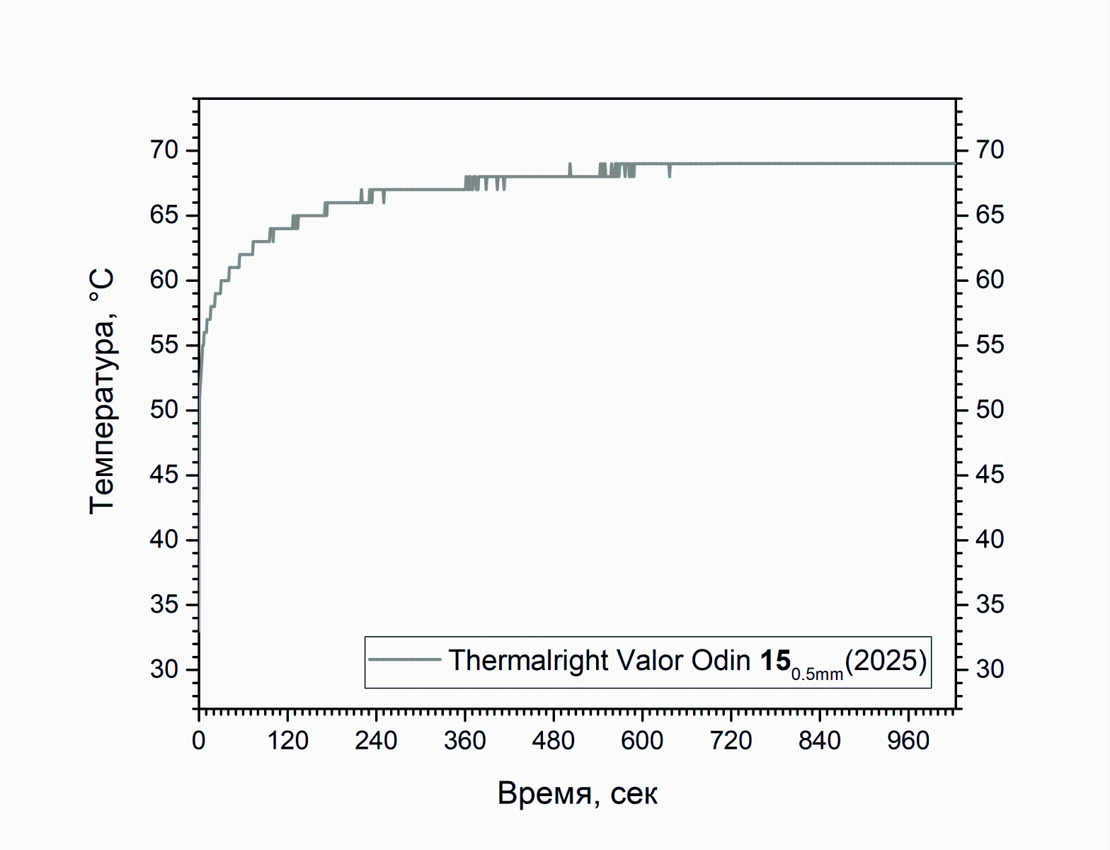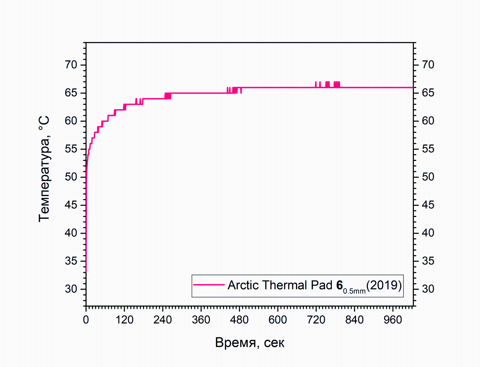 Ничего особенного, примерно уровень тех же "голубых арктиков". Насколько я помню - упругость на сжатие больше, по этой причине температура и "почти не плавала" по ходу нагрева (хотя, скорее всего, ощутимое сжатие имело место на почти прямом участке), а заполненный прокладкой зазор был скорее всего шире. Максимальная температура 66 градусов, средняя температура 64.56 градуса. Видимое на графике отклонение кривой нагревания от вертикали началось примерно на 2-3 градуса выше, но изгиб кривой по ходу выравнивания температуры был более крутым. Цена такого вот "половинчатого" (100×50 мм) листа на момент покупки 146 рублей, в данный момент (начало декабря 2025) 318 рублей. Посмотрим что покажет следующий экземпляр.
