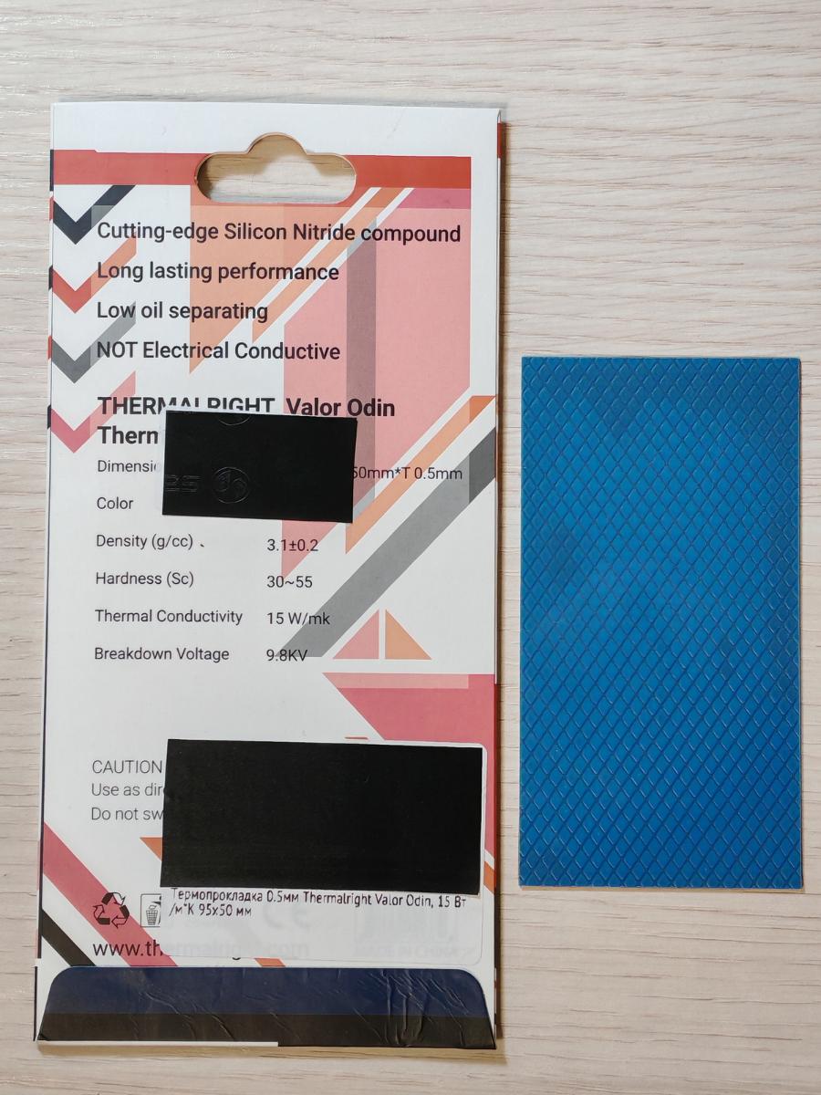 Ну эти термопрокладки до поры до времени считались "ну просто самыми трушными", на одном (примерно) уровне с Thermal Grizzly Minus Pad 8. И название-то какое эпичное! По имени одного из главнейших богов древней германской мифологии, что как бы намекает на "труъ" показатели в эксплуатации, на вечность и на неубиваемость. Упаковка в виде пёстрого картонного пакета с линейной геометрической абстракцией строго под углом 45 градусов, одна из защитных плёнок с логотипом производителя, другая синяя бугристая "как на дешёвых китайцах", что вполне может намекать на подделку. Что ж, посмотрим.