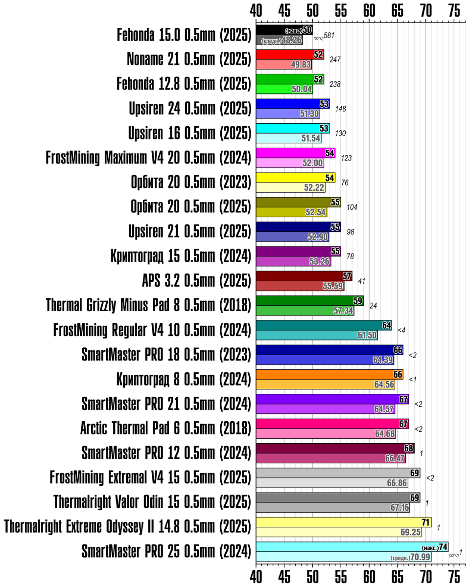 Если честно - я в шоке! И это мало сказать. Максимальная температура 50 градусов, средняя температура 48.26 градуса! Оторвалась от ближайших преследователей как господин Болт из Ямайки в лучшие его годы. Но не стоит обольщаться - термопрокладка типа "шпаклёвка", имеет меньшую упругость на сжатие по сравнению с прежним образцом, при толщине 0.5 миллиметра (и тем более в случае нанесения на видеочип сугубо для кратковременного тестирования) легко рвётся при демонтаже системы охлаждения. Уверен, что при более достоверном тестировании (при соблюдении зазора и при работе с более удобной для экспериментов толщиной термопрокладок при подходящих условиях) разница столь колоссальной точно не будет. Но и вряд ли на грани погрешности. Такой же лист размером 85×45 мм обошёлся мне в конце октября 2025 года в 423 рубля. Сейчас (начало декабря 2025) продаётся от 623 рублей и дороже. В пересчёте на "полный" (100×100 мм) лист это соответственно 1106 и 1629 рублей. Весьма недёшево. Но и не бездарно. Ну и помните, что самые тонкие прокладки всегда самые дорогие... за единицу массы, разумеется.