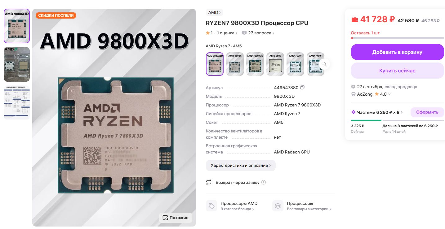 Первым делом я зашел на страницу товара, с которой был заказан процессор, и меня насторожило следующее: несмортя на то, что товар назван 9800X3D, фото на картинке от процессора 7800X3D - предполагаю, чтобы покупатель не смог увидеть, что фото на странице товара и сам товар по факту отличаются. На данный момент цена составляет уже 41 728 рублей и появилась оценка товара 1 звезда(на момент покупки человеком процессора её не было) - видимо, тоже кто-то заказал и "оценил" то, что пришло.