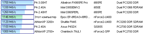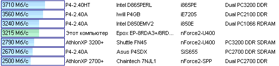 Согласитесь, неплохо для одной планки разогнанной и работающей синхронно 333-й памяти. К сожалению, выше 215 она не держит, хотя если выставить шину 220, а память поставить как 83%, мы с легкостью обходим RIMM.