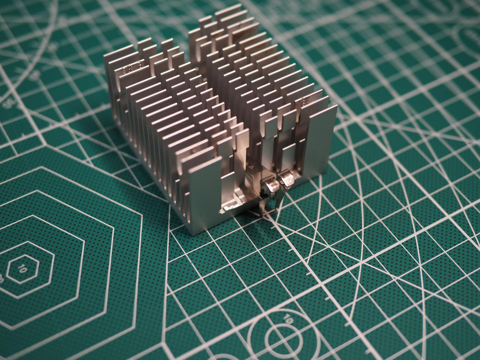 Увы, под рукой не оказалось оригинального радиатора для процессора, так что нашел более-менее подходящий, но проблема была в том, что пружинная крепежная пластина отказывалась устанавливаться, ей мешали парочка ребер, которые пришлось спилить.