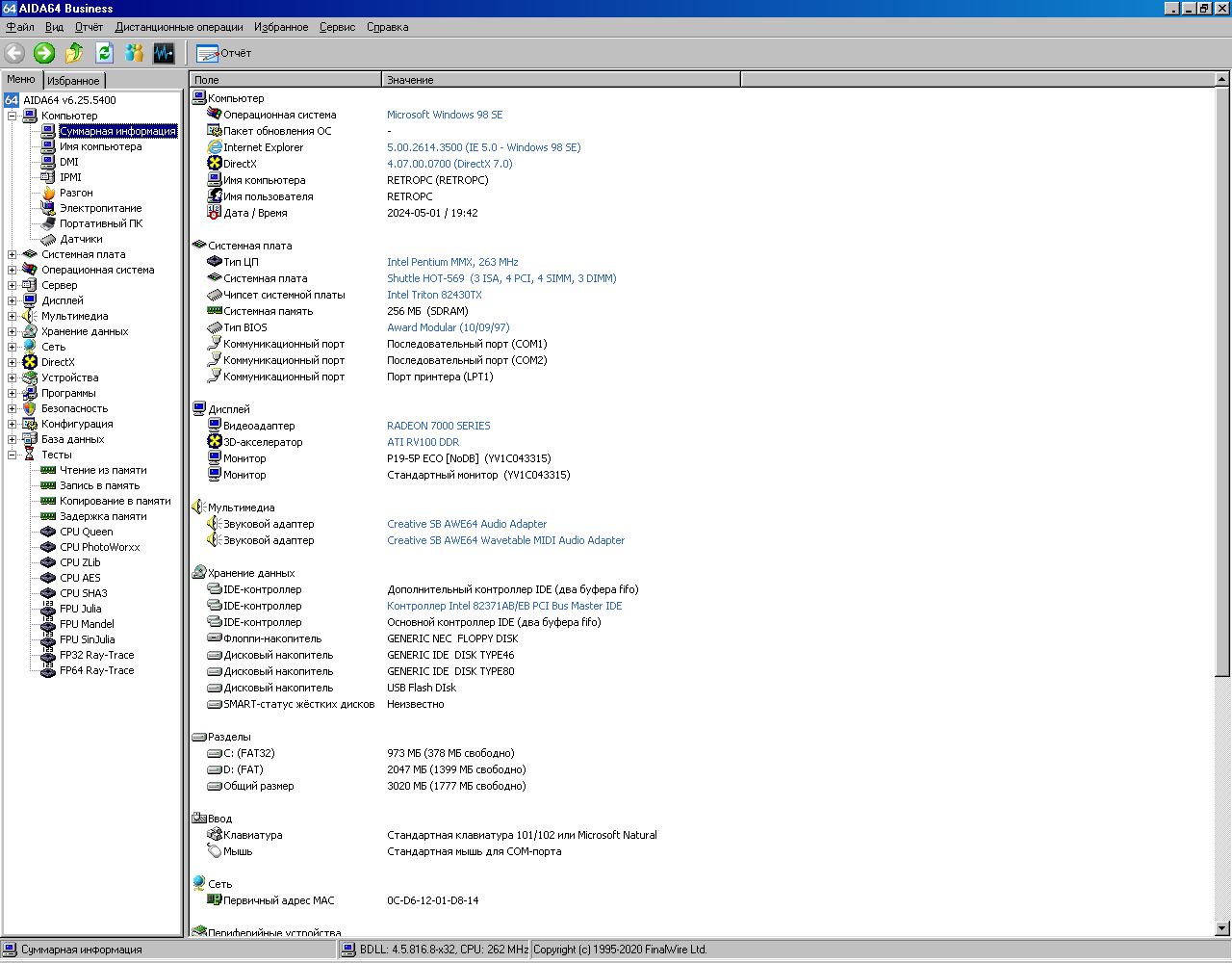 Теперь можно сравнить двоих кандидатов в ретро-ПК на базе «первопней». Напомню, что условия тестирования практически одинаковые: одинаковые видеокарта и звуковая карта, одинаковые системные диски, одинаковые версии AIDA64, 3DMark99 и Final Reality. Только количество оперативной памяти разное – у Pentium 233MMX 256Мб, а у Pentium Pro 200 только 128Мб, причем, еще и гораздо более медленной.