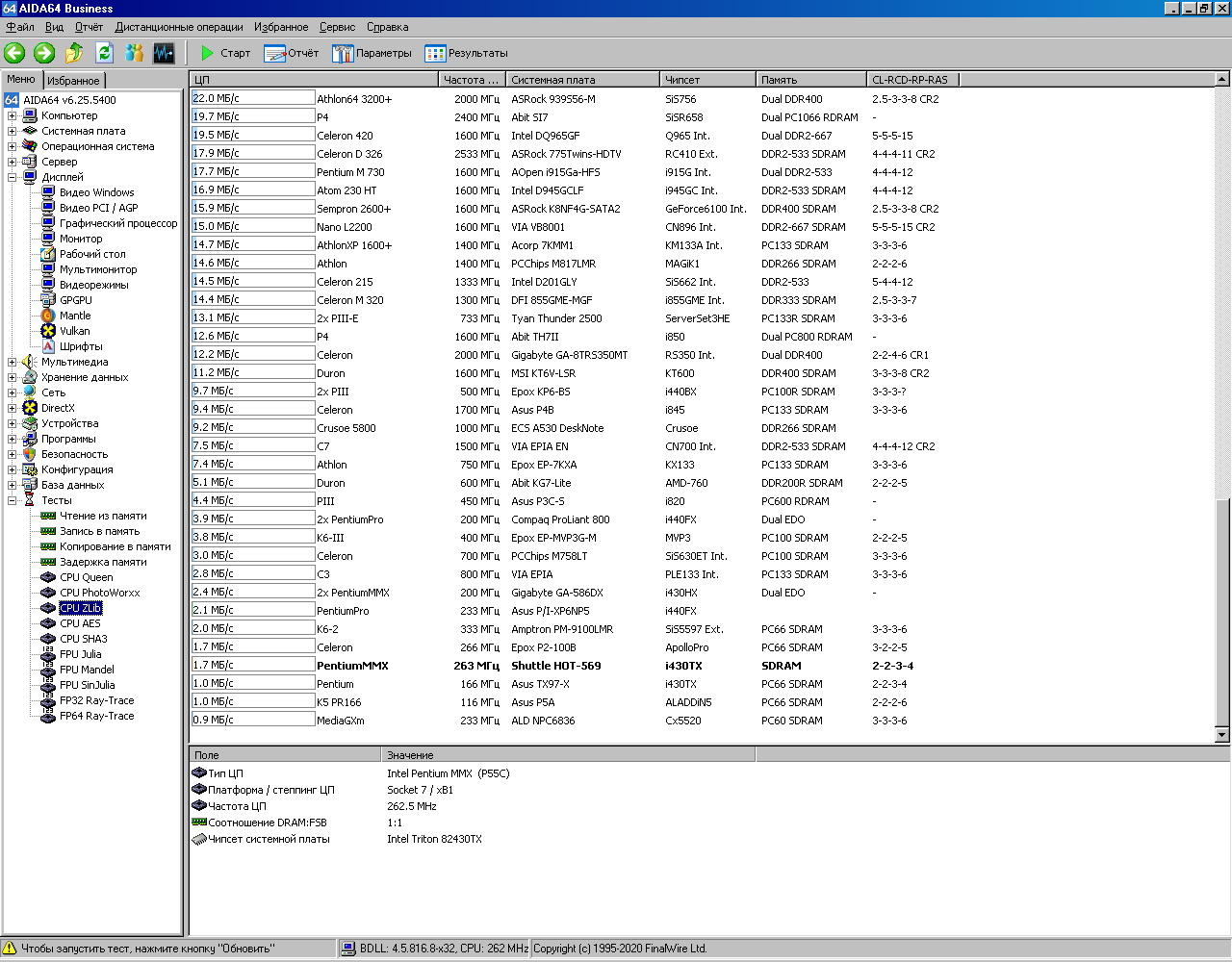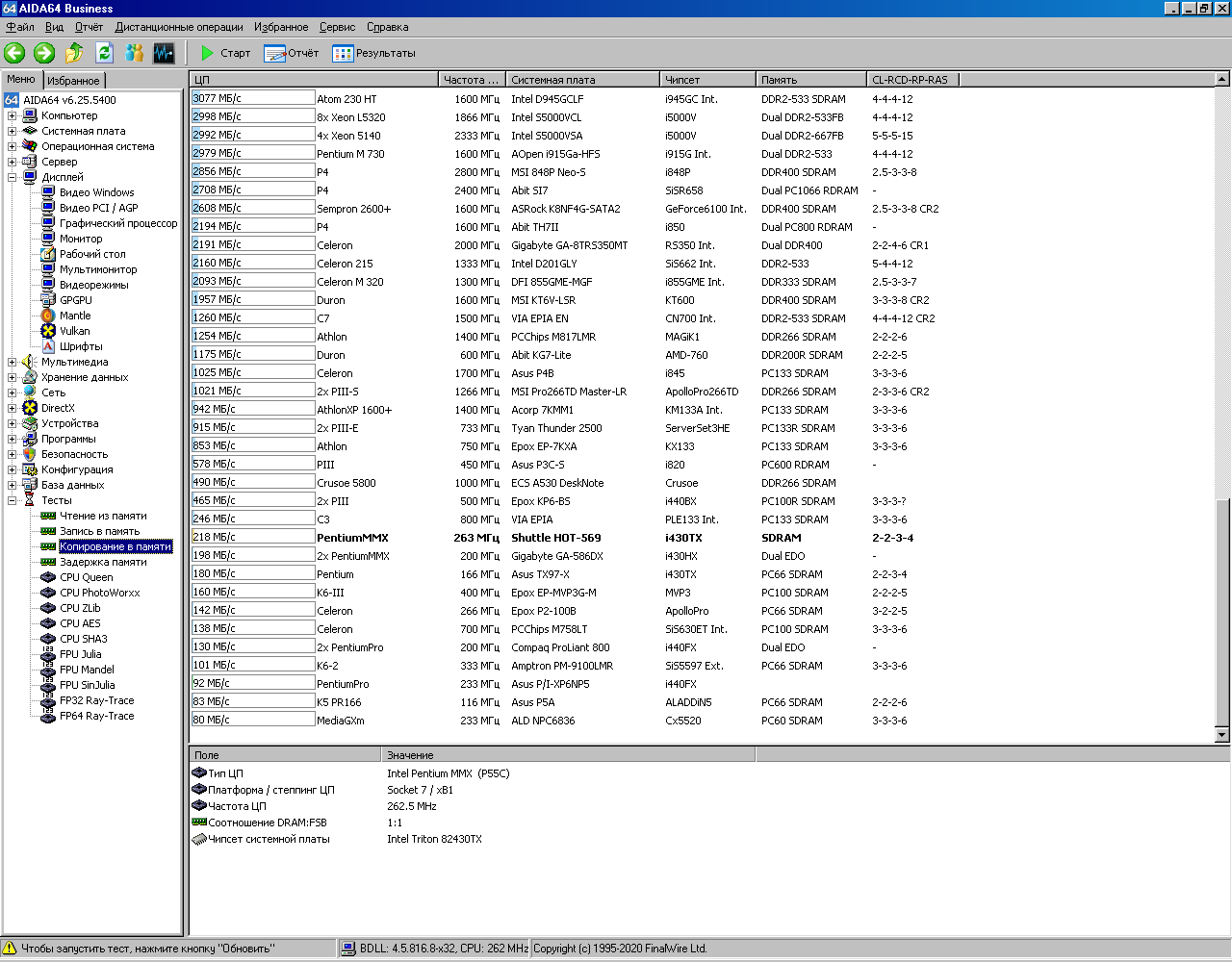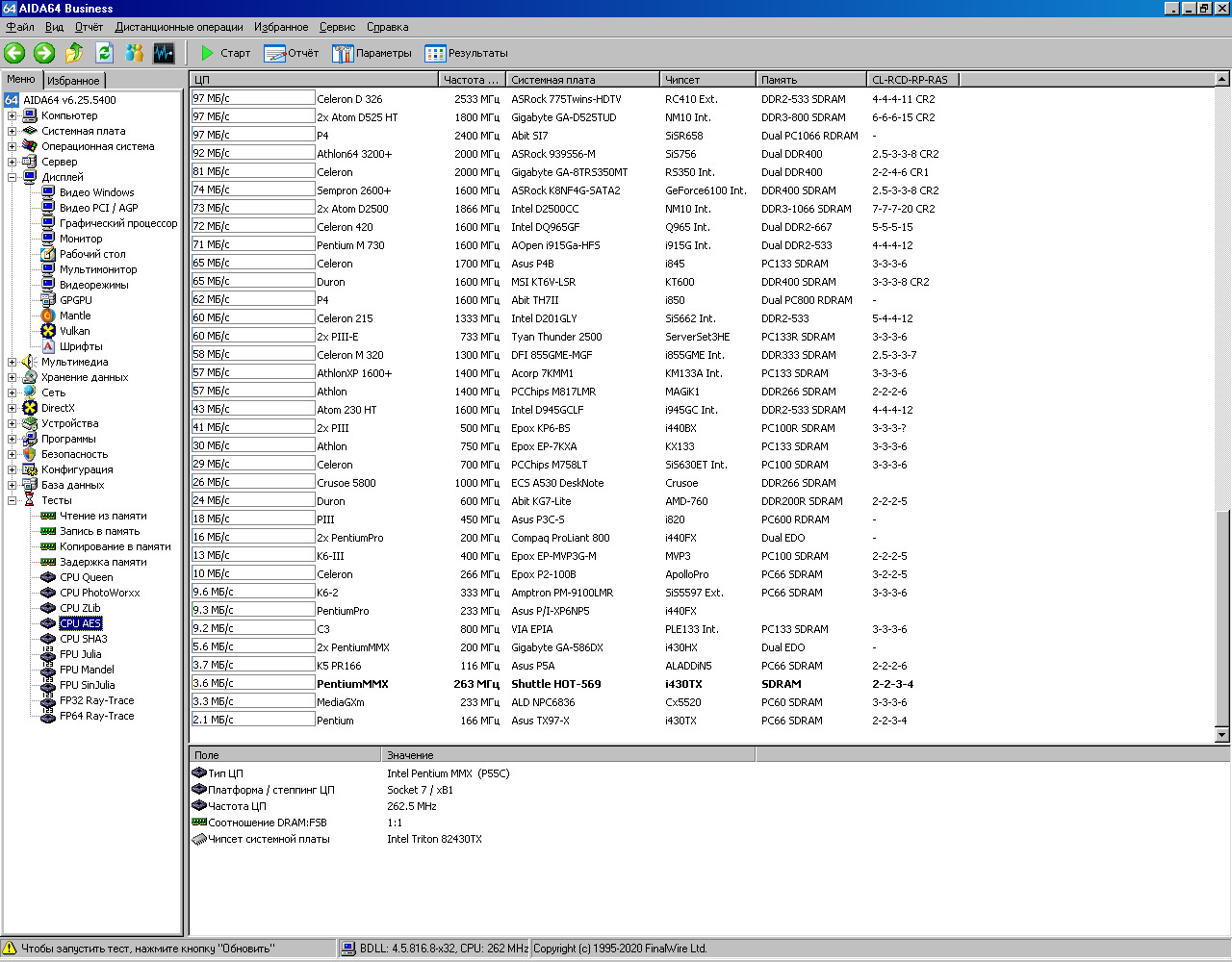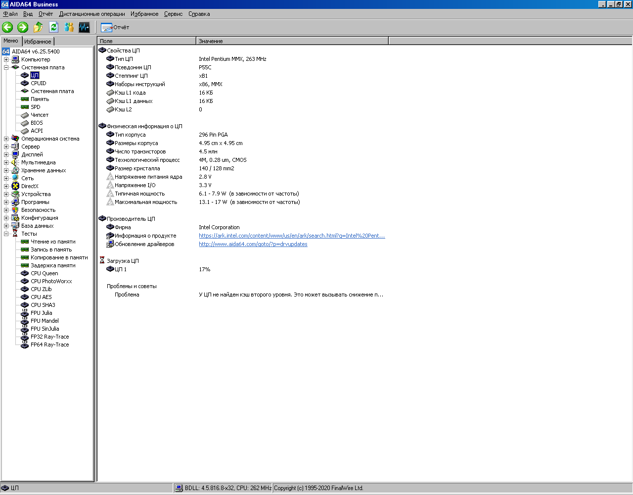 Далее привожу результаты тестирования Pentium 233MMX в AIDA64. Для удобства в этой же базе данных сохранены результаты тестирования Pentium Pro 200 (смотрите строку «Pentium Pro 233 P/I-XP6NP5»). Спойлер: в конце статьи будет краткая табличка со всеми результатами.