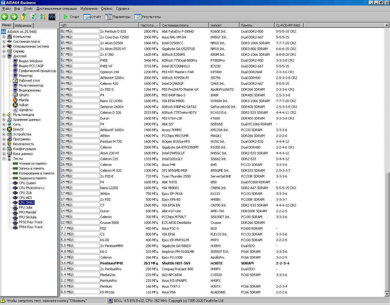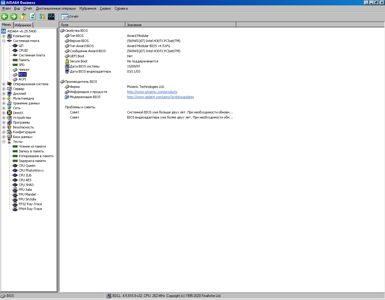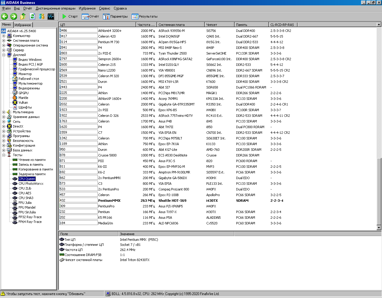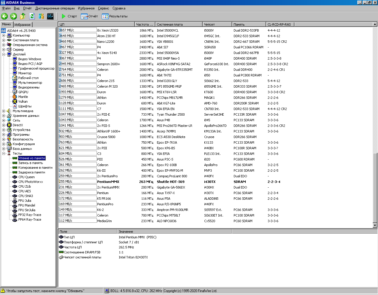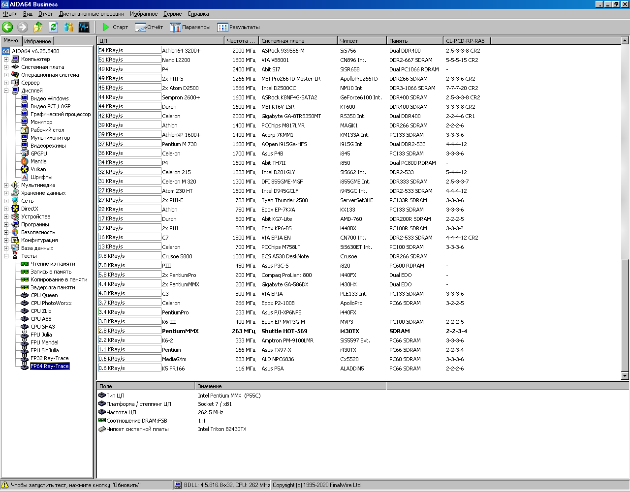 Далее привожу результаты тестирования Pentium 233MMX в AIDA64. Для удобства в этой же базе данных сохранены результаты тестирования Pentium Pro 200 (смотрите строку «Pentium Pro 233 P/I-XP6NP5»). Спойлер: в конце статьи будет краткая табличка со всеми результатами.