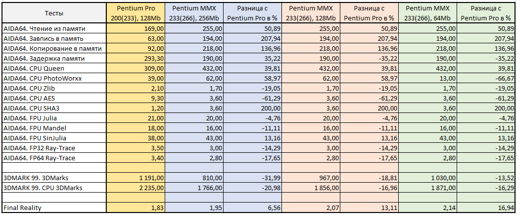 Для удобства свел результаты тестов в табличку. Положительная разница в процентах означает, что Pentium 233(266)MMX опережает Pentium Pro 200(233), а отрицательная - наоборот, отстает.