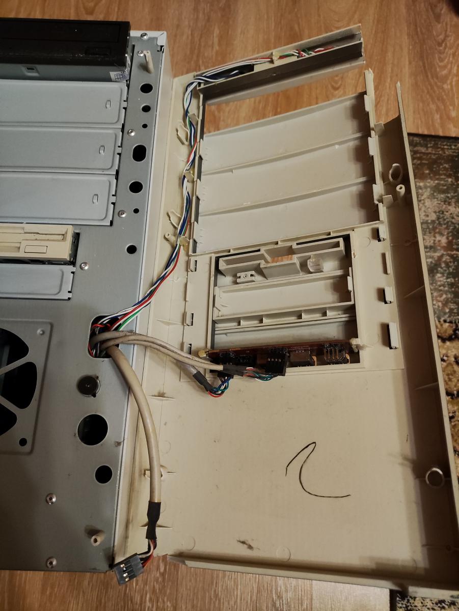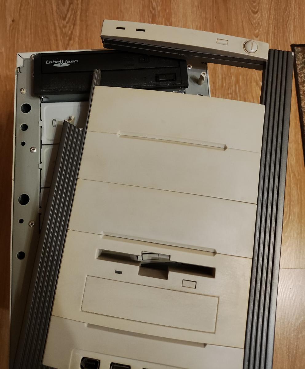 Не было бы Voodoo 3 3000, именно эта карта заменила бы Radeon 7000Двигаемся дальше. Сам я тогда сетовал на то, что корпус использовал тот, что был под рукой, весьма современный и неинтересный Cooler Master. Сейчас все по-другому – ПК полностью переезжает в новый дом, нашелся весьма аутентичный корпус с неизбитой внешностью родом из конца 90-х, чего, собственно, и хотелось изначально. С ним, кстати, приключилась неприятная история, которая неслабо так откинула по времени проведение апгрейда. Нашел я этот корпус на известной барахолке, но весьма далеко, так что пересылка была неизбежна. Продавец согласился, сказал, что все будет «на высоте» и отправил. Корпус приехал, прихожу в пункт выдачи – бааааа! Корпус упакован только в пару слоев «пупырки». Никаких коробок или иных защитных мер. Ничего. Срываю «пупырку», под ней еще слой пищевой пленки, которым корпус плотно обмотан. Визуально все, вроде, ОК, вижу, что немного замялся нижний металлический угол, но ничего криминального. Несу домой, где срезаю пленку и… на меня в буквальном смысле высыпается передняя панель, она оказалась раскрошенной на много мелких осколков, которые просто были плотно зажаты пленкой.
