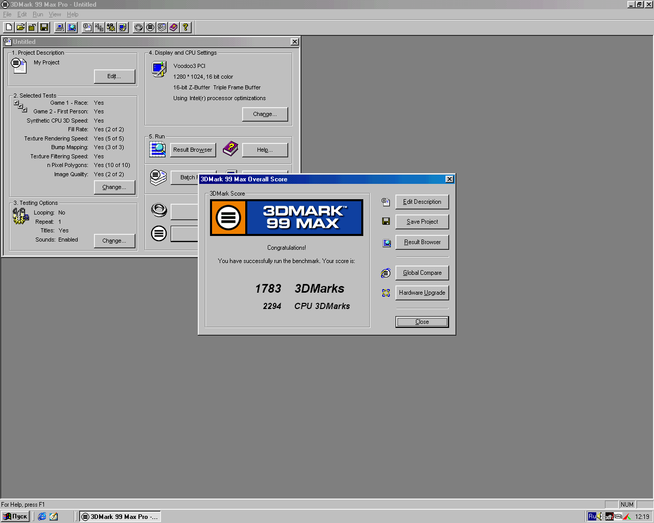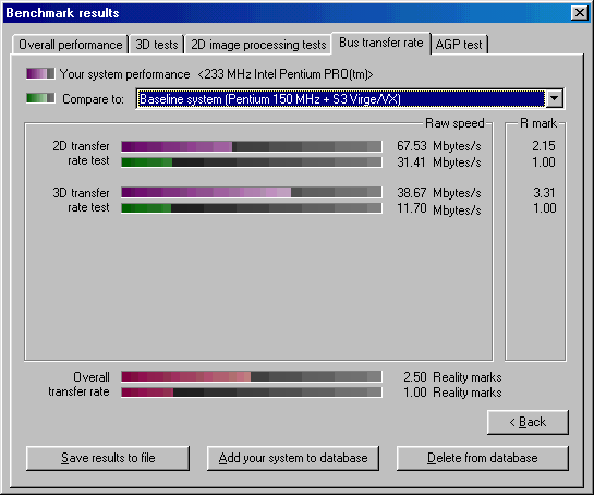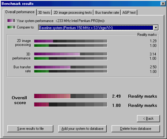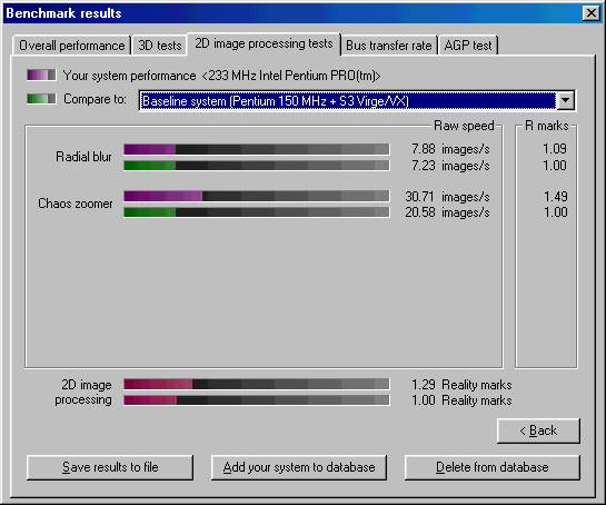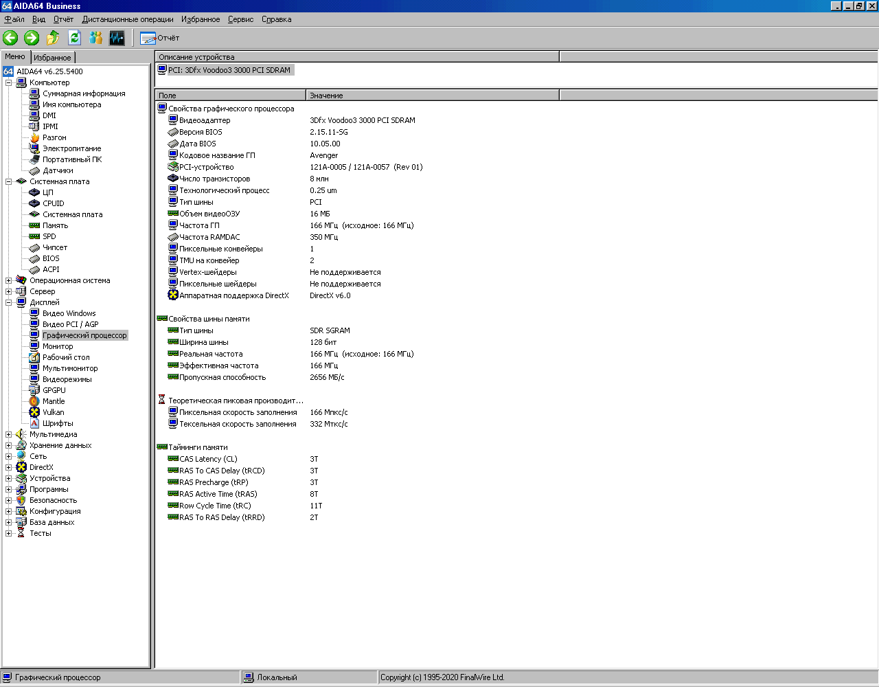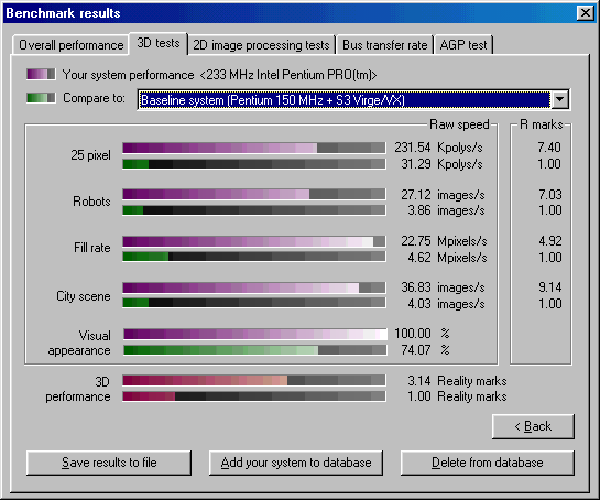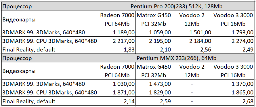 Далее прогнал Final Reality и 3DMark99 MAX. Для наглядности привожу результаты в таблице ниже по тексту. Также в таблицу для ориентира включил результаты еще одной ретросборки на базе Pentium 233 MMX, о которой уже писал ранее. Еще в таблице имеется Voodoo 2, но результаты указаны не полные. Это объясняется тем, что попала Voodoo 2 ко мне в руки в плачевном состоянии - были проблемы с красным цветом, он отсутствовал. Успев пройти ряд тестов, ускоритель благополучно превратился в тыкву. Видимой причиной была отвалившаяся нога на чипе FBI, но тесты с помощью широко известной в узких кругах тестовой утилиты mojo показали еще ряд проблем с памятью и одним из TMU. Такой ремонт невозможен за отсутствием нужных компонентов, но может быть когда-нибудь...