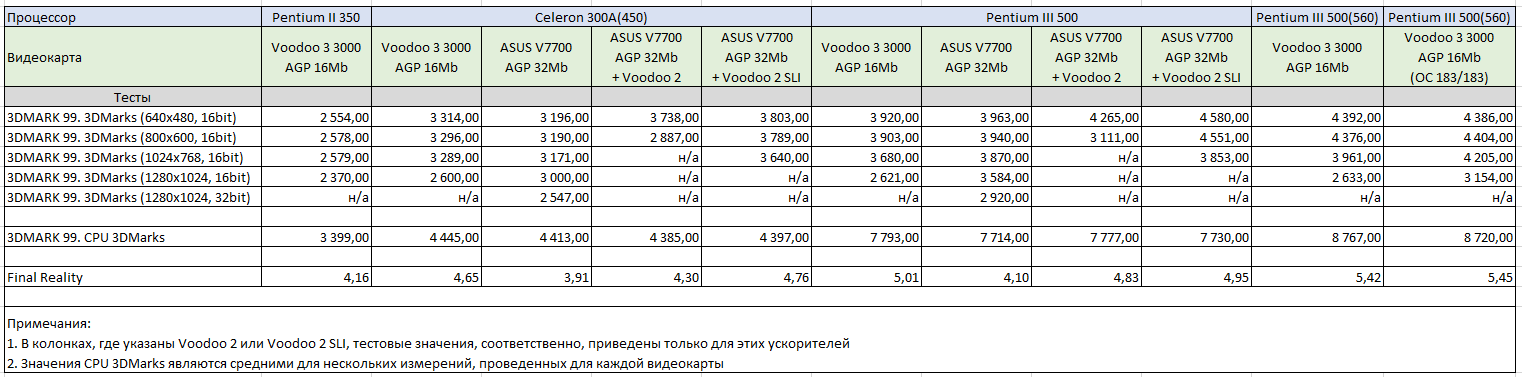 - Voodoo 3 3000 на разогнанном Pentium III 500 догоняет Voodoo 2 SLI, при этом она существенно (раза в 2-2,5) дешевле Voodoo 2 SLI и требует к себе меньше внимания, а если даже сгорит, то финансовые потери будут не в пример меньше, чем при крахе хотя бы одного из ускорителей Voodoo 2 SLI.