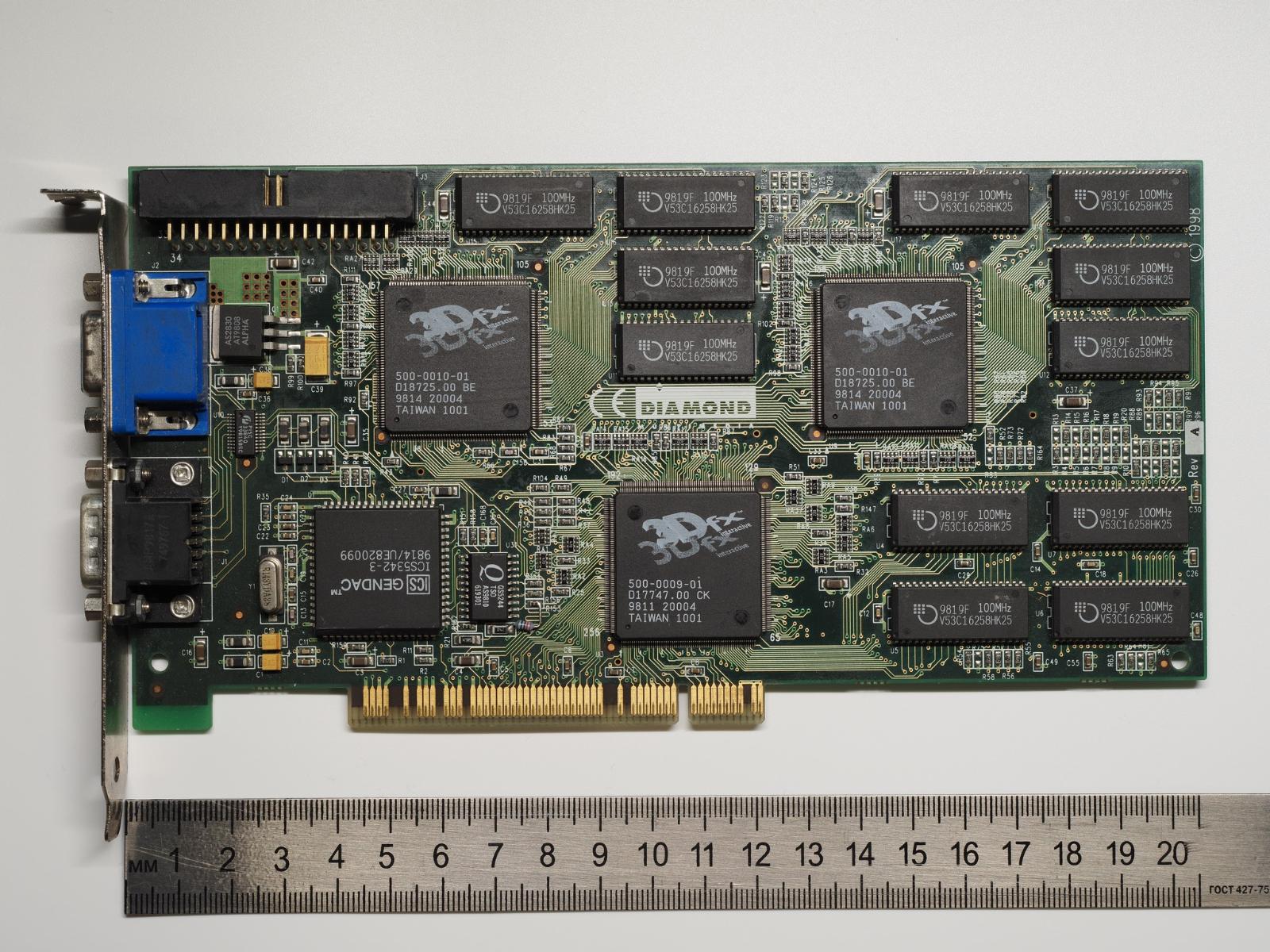 Примечание: обратите внимание, что у Diamond Monster 3D II 12Мб на обратной стороне часть чипов памяти выглядят по-другому. Ранее это была версия на 8 Мб, а еще 4 Мб были просто допаяны на свободные места. Никаких прошивок при этом не требуется, только память того же типа, паяльное оборудование и умелые руки. Спасибо за это Владимиру, гуру в вопросах ремонта и модернизации карт Voodoo.