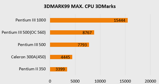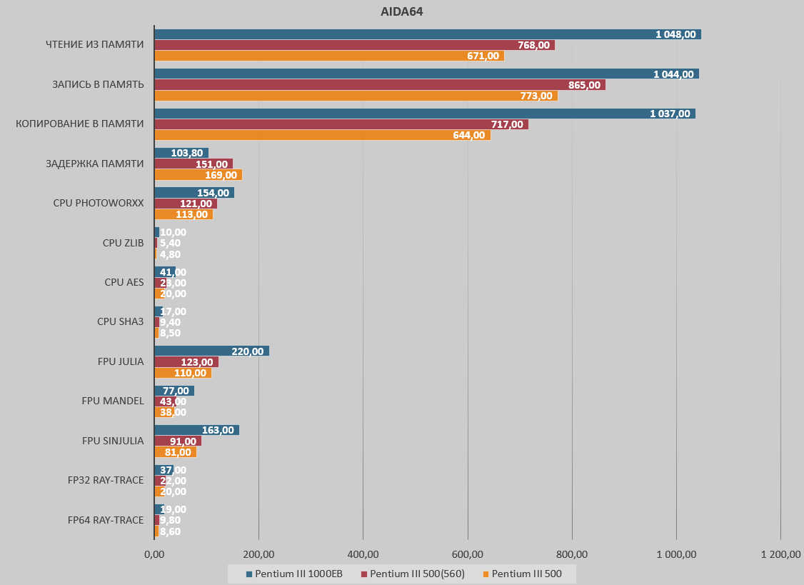В предыдущей части выбор был сделан в пользу Pentium III Katmai. Поэтому для наглядности приложу тесты и для него, чтобы понимать, насколько «прыгнула» производительность процессора.