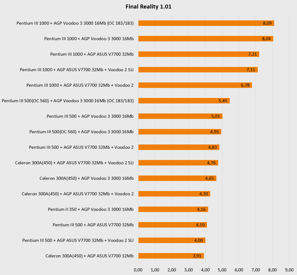 Настало время подвести очередной итог. Есть ли смысл использования Voodoo 3 3000 с быстрыми процессорами? Да, есть. Быстрый процессор максимально раскрывает эту карту. Но при этом есть старые версии некоторых игр для API Glide, которые будут недоступны на этой карте. Таких игр совсем немного и для большинства из них есть обновления, позволяющие использовать родной для них Glide. Так что как относительно бюджетный вариант такая конфигурация весьма актуальна. При этом подавляющее большинство DOS-игр также не останутся за бортом.