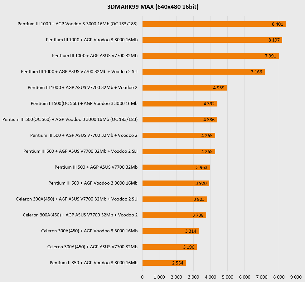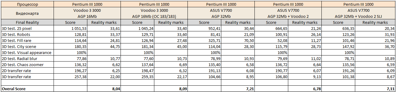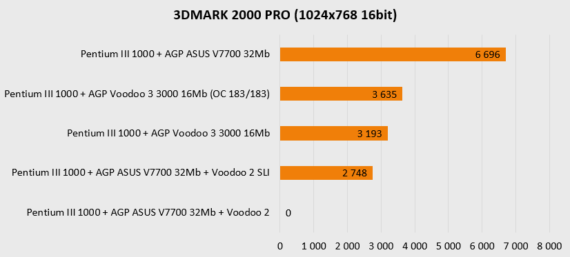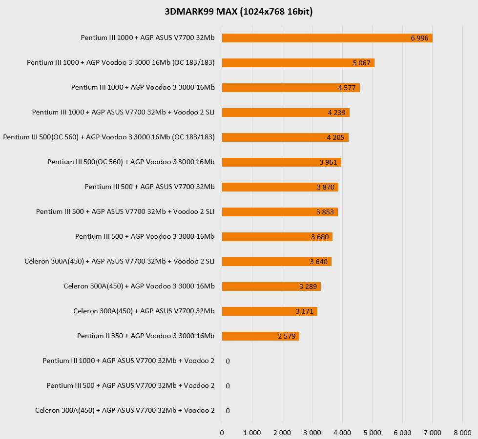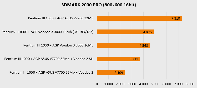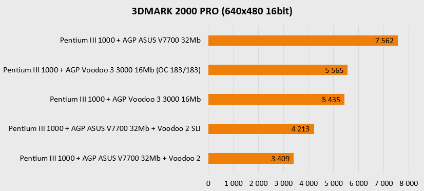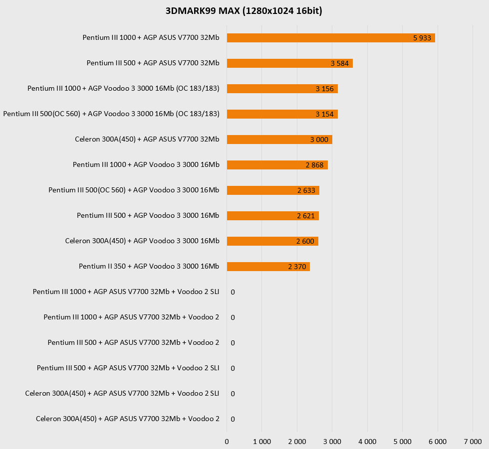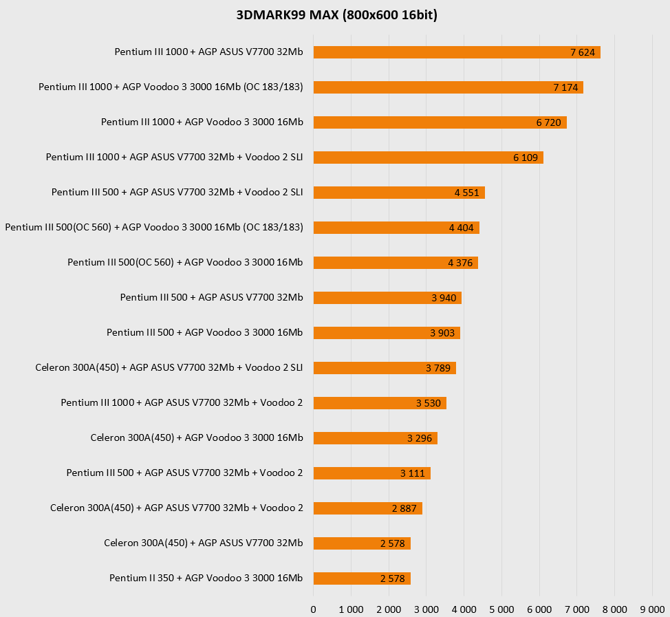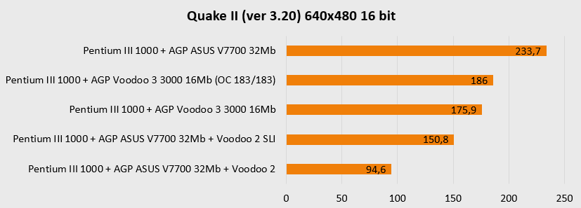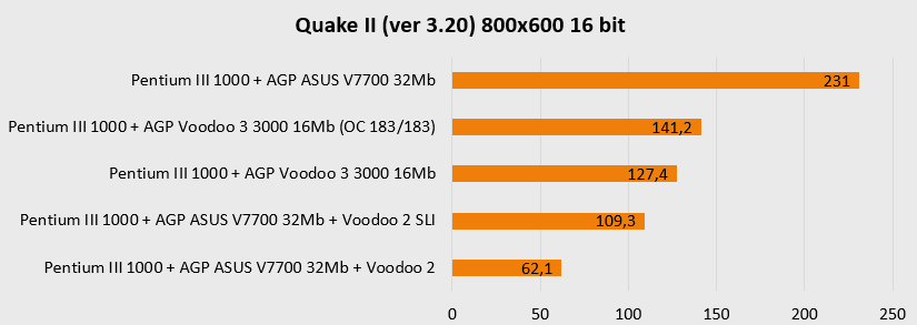 Резко увеличенная мощность платформы в целом наглядно показывает, что более новая видеокарта (ASUS V7700) чувствует себя заметно увереннее в актуальных для нее разрешениях, то есть выше 800х600 и просто не оставляет шанса «старичкам» при 1280х1024. Более новая архитектура, больший объем памяти и ярко выраженная процессорозависимость перемещают ее в лидеры для игр в D3D и OpenGL. А вот в низких разрешениях, актуальных для более старых игр, все не так однозначно – тут безраздельно главенствуют старички в лице карт на чипах Voodoo, так что гораздо более новому ASUS V7700 приходится несладко. Вот где выражение «тряхнем стариной» становится как никогда актуальным – быстрый процессор в состоянии выжать еще немного соков из карт Voodoo.