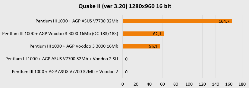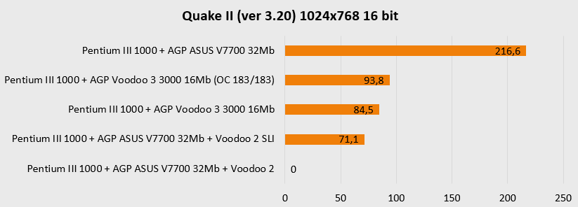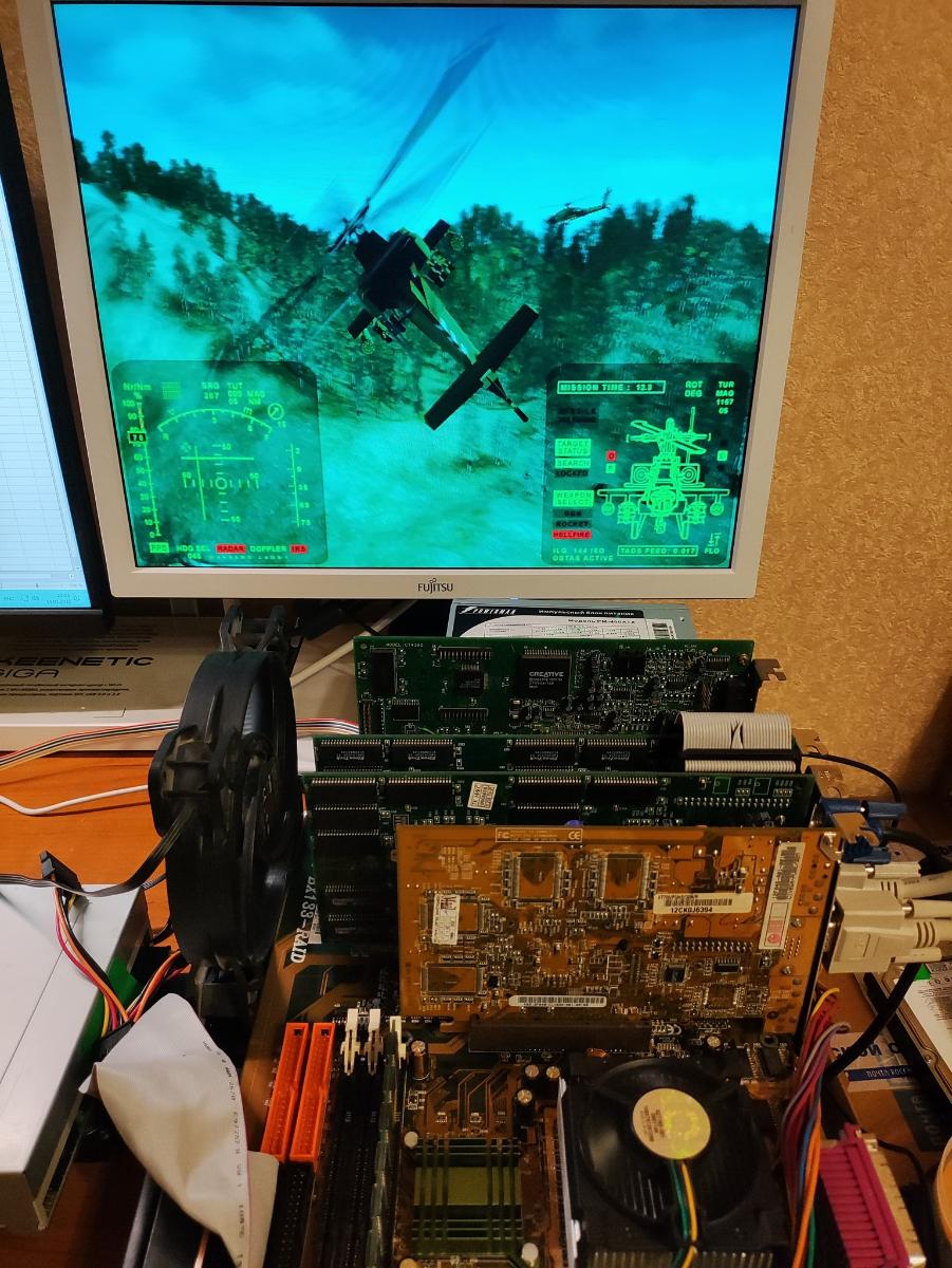 Но все же для быстрого процессора более предпочтителен иной вариант - ASUS V7700 совместно с Voodoo 2 SLI. Это совсем недешево, зато позволит максимально реализовать потенциал сборки, D3D и OpenGL игры будут буквально летать на ASUS V7700, а в исполнении дуэта Voodoo 2 любые Glide-игры будут доступны в разрешении до 1024х768. Тут уже никаких компромиссов – полная совместимость со всеми играми, включая подавляющее большинство очень старых DOS-игр. Универсальность стоит дорого, но хорошо то, что на данный момент эту универсальность, воплощенную в «железе», еще можно поймать за хвост. Желаю всем удачного улова и долгих лет древним артефактам прошлого. До новых встреч!