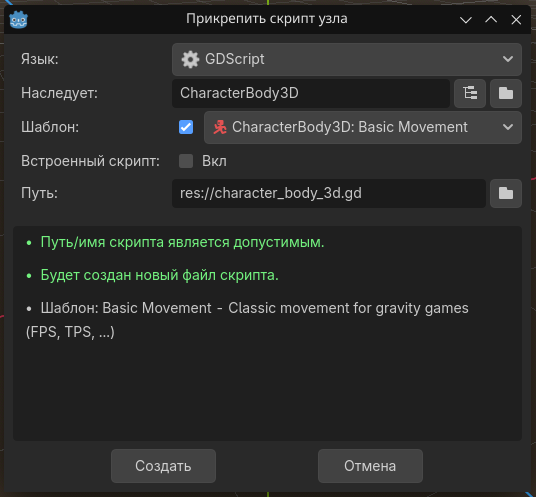 Помимо этого, если в Godot 4 с нуля создавать сцену без библиотеки, то в Godot есть такая нода, как CharacterBody, и если к этой ноде создать скрипт, то движок предложит прикрепить готовый скрипт передвижения Basic Movement.