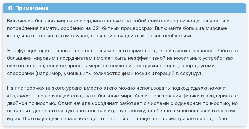 Но это лишь часть страницы из документации. Чимба как будто бы намеренно скрывает всё остальное, где сказано, что большие мировые координаты отключены в Godot по соображениям производительности. Зачем большие мировые координаты, если они полезны только в малом числе специфических игр, и в большинстве случаев проблема решается стандартными методами оптимизации.