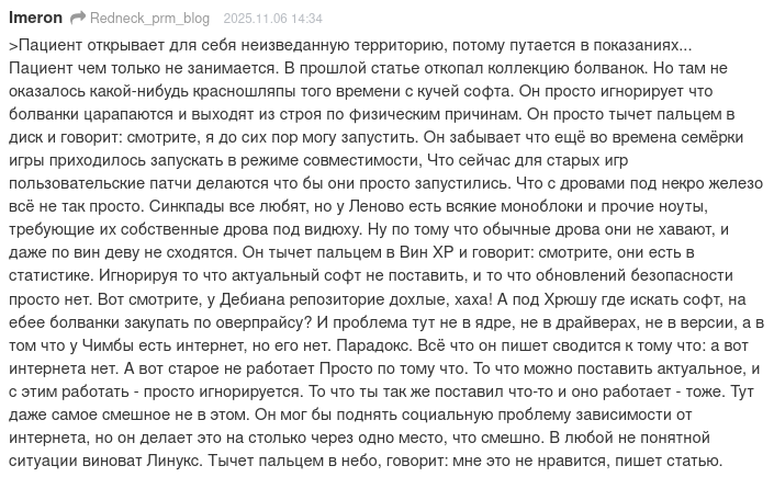 Хоть статьи Чимбы и посвящены Godot, но автор в свойственной ему манере не упустил возможности для начала приплести ещё и Linux. Не вижу смысла подробно разбирать весь его бред, я просто приложу скриншот комментария, который ёмко описал все мои мысли.