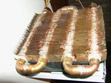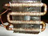 Из деталей собираем радиатор (см. рисунок), промазываем места пайки флюсом, прогреваем промышленным феном и пропаиваем. Колечки из проволоки, с одной стороны фиксируют расстояние между пластинами, а с другой – под ними залитый припой обеспечивает отличный тепловой контакт между трубками и пластинами. На уровне мировых стандартов, так сказать.