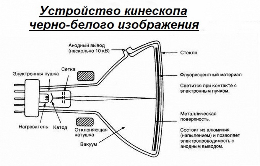 Основным элементом таких телевизоров является кинескоп, он же электронно-лучевая трубка (ЭЛТ). Принцип его работы основан на свечении люминофора, нанесенного на обратную сторону экрана при попадании на него пучка электронов, разогнанных до большой скорости. Этот узкий пучок электронов формируется электронной пушкой, расположенной позади экрана на некотором расстоянии от него.