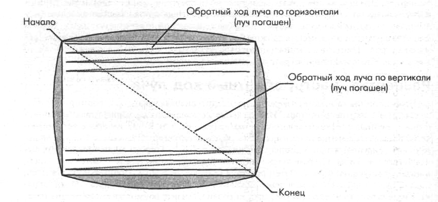 Формирование растра на экране кинескопа Растр формируется путем перемещения электронного пучка по поверхности экрана с левого верхнего угла направо (прямой ход), прорисовывая первую строку. Затем быстро возвращается влево ниже первой строки (обратный ход). После чего снова перемещается слева направо, прорисовывая вторую строку, затем третью, и так далее, до тех пор, пока не достигнет нижней части экрана. Затем быстро перемещается в верхний левый угол экрана и весь процесс повторяется заново.