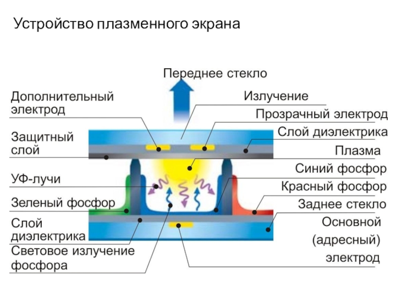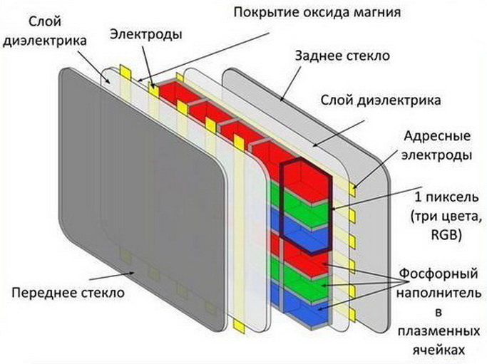 Конструктивно плазменная панель состоит из множества слоев. Матрица из газонаполненных капсул заключается между двумя стеклянными пластинами, в которые втравлены тонкие электроды, соединяющиеся с плазменными капсулами. И вся эта конструкция дополнительно размещается между защитными стеклами.