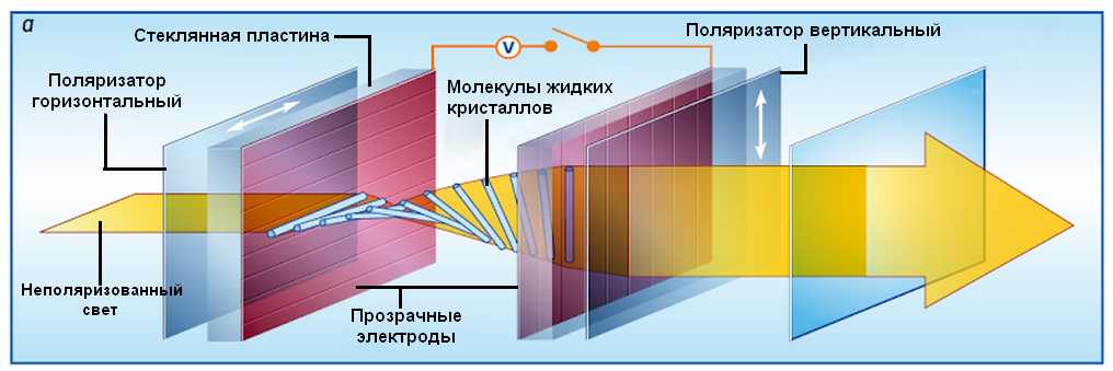 Работа ЖК-экрана заключается в способности жидких кристаллов изменять плоскость поляризации проходящего через них светового потока.