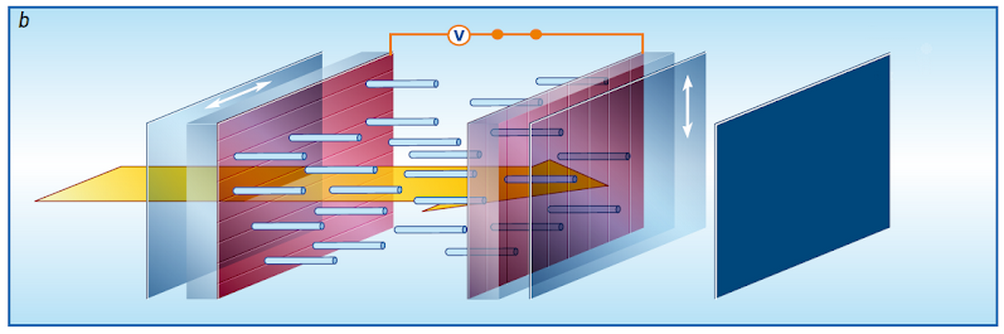 Чтобы свет прошел сквозь весь этот слоеный пирог, нужно, чтобы жидкие кристаллы поворачивали поляризацию светового потока от одного фильтра к другому на 90 градусов.