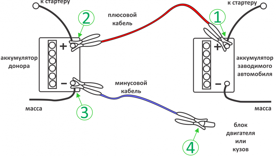 заводимого автомобиля, так и к минусовой клемме аккумулятора
