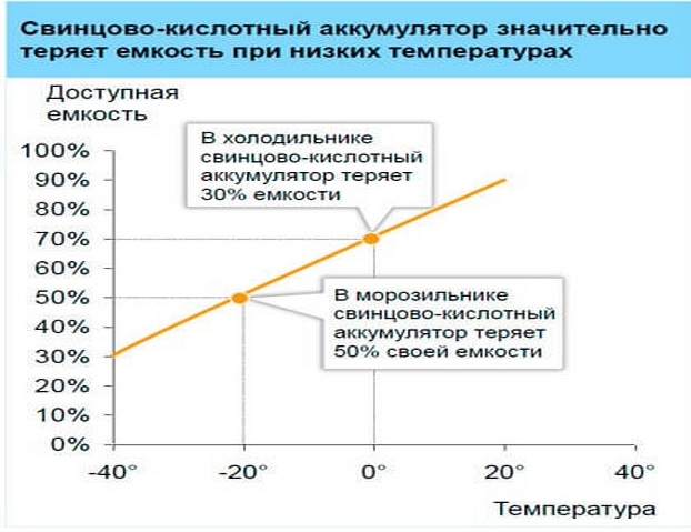 Также емкость аккумулятора зависит ещё и от его температуры, чем она ниже, тем меньше и ёмкость, ну соответственно и ток. Этот процесс обратим, при нагреве аккумулятора утраченная им «замерзшая» емкость восстанавливается.
