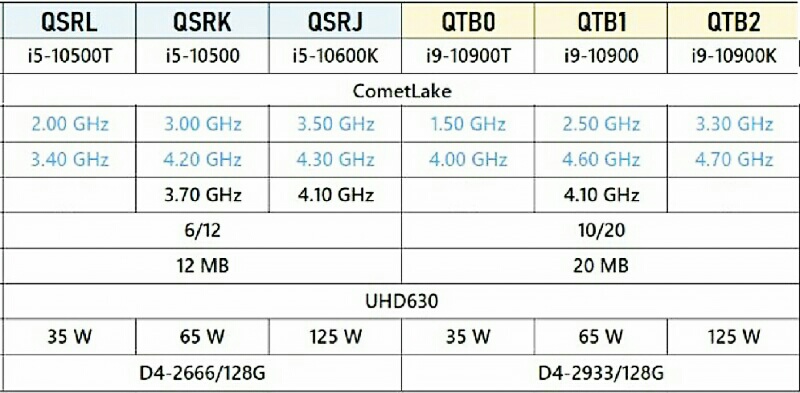 И сводную таблицу «инженерных» процессоров десятого поколения (CometLake):