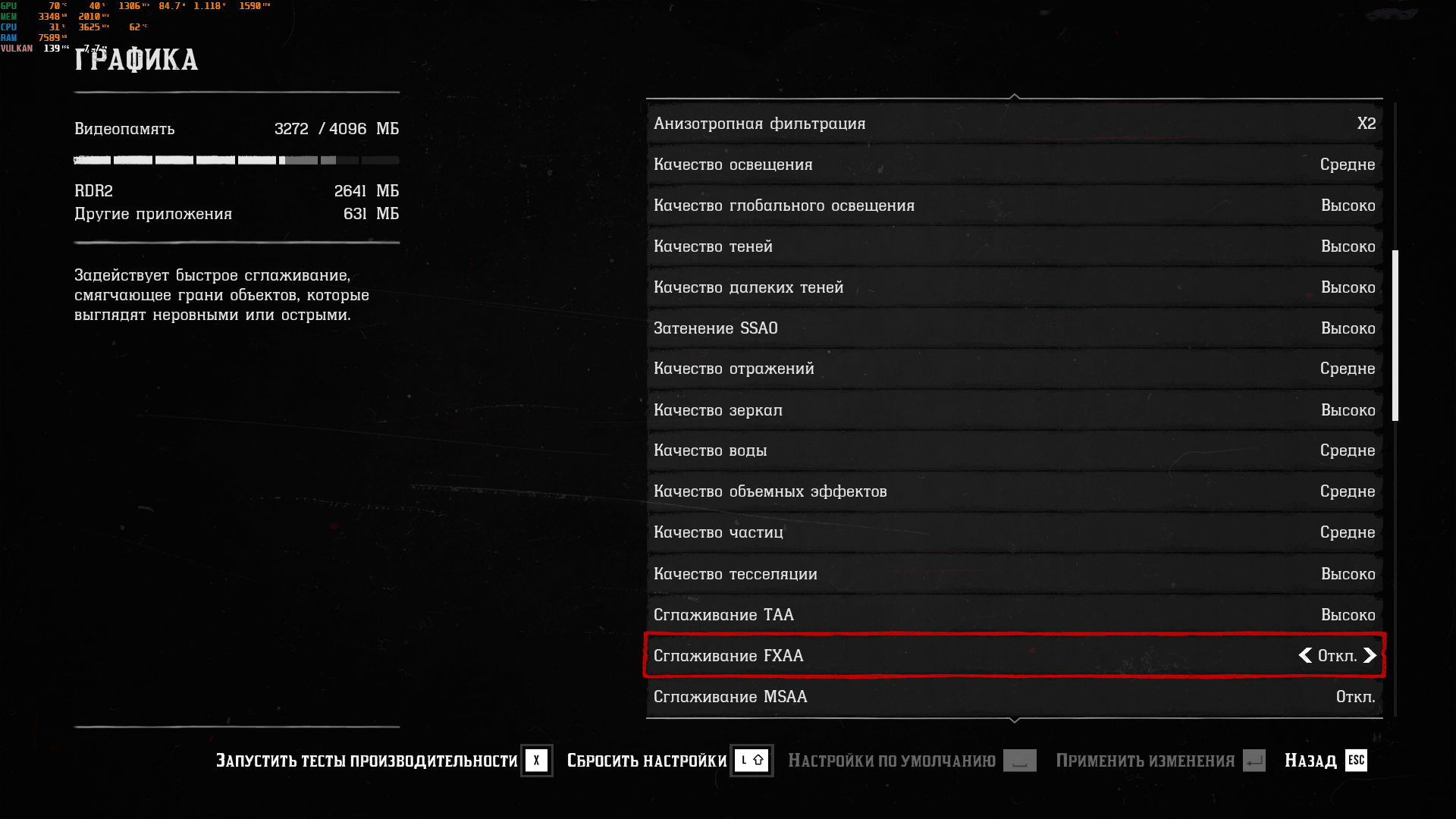 В FullHD на средне-высоких настройках наша горячая штучка неплохо себя показывает: 40 фпс в населённых пунктах в среднем и иногда поднятия до плавных 60.