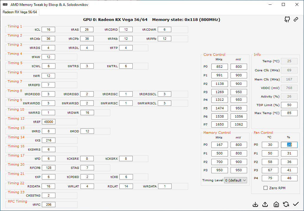 Если же говорить откровенно никакого разгона относительно паспортных частот практически и нет. Сами посудите ну что это за разгон с 1590MHz до 1650MHz по ядру, память же была разогнана до частоты 950/1900MHz. С другой стороны, рабочая частота под нагрузкой изменилась с 1300 MHz до 1620 – 1650MHz. Вариант перепрошивки BIOS был не очень интересен владельцу видеокарты, так как прошивка на BIOS от старшей Vega 64 не дала бы ничего кроме более высоких частот работы памяти за счет повышенного напряжения зашитого в BIOS видеокарты Vega 64. Так же были чуть-чуть настроены тайминги.