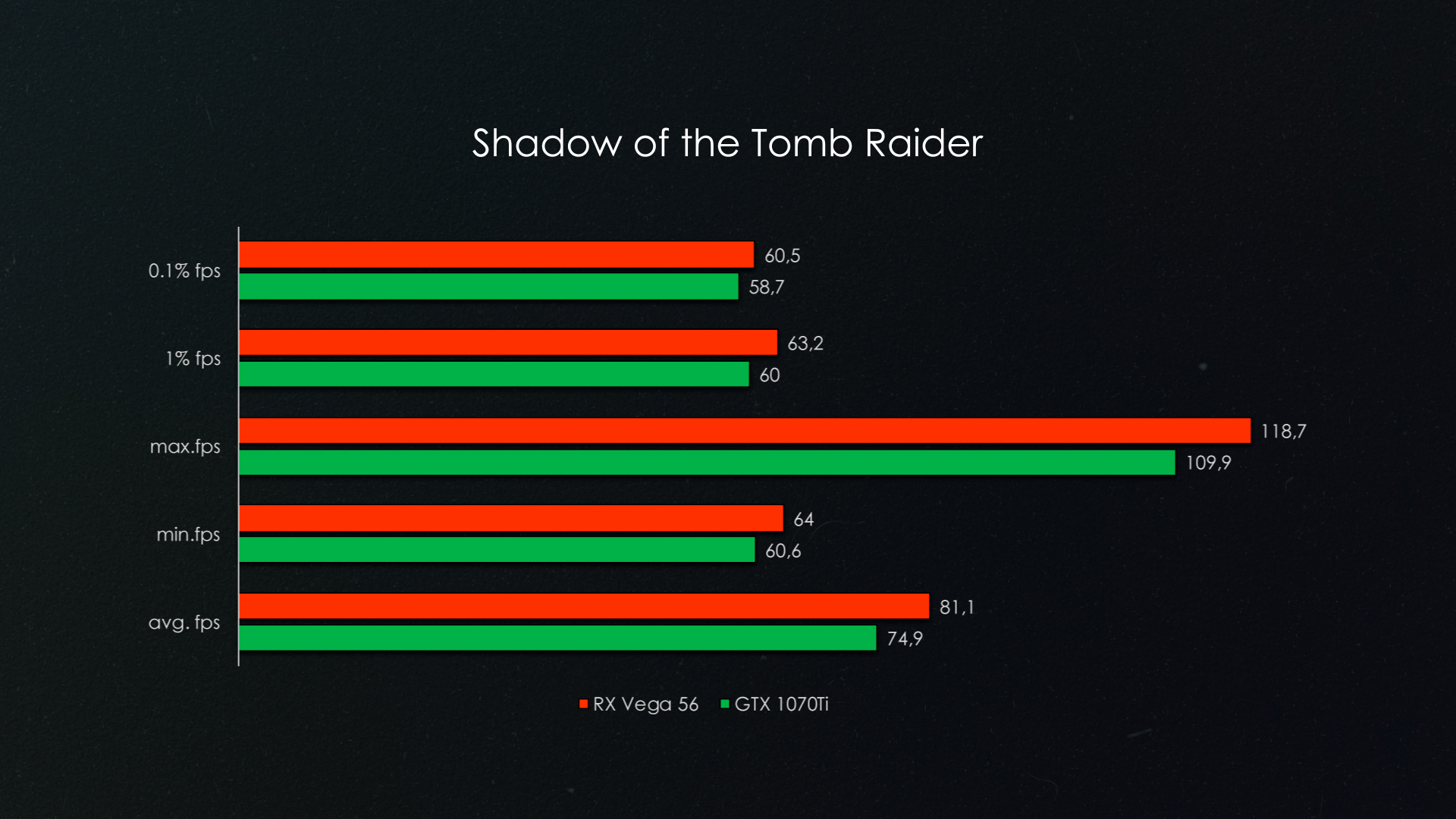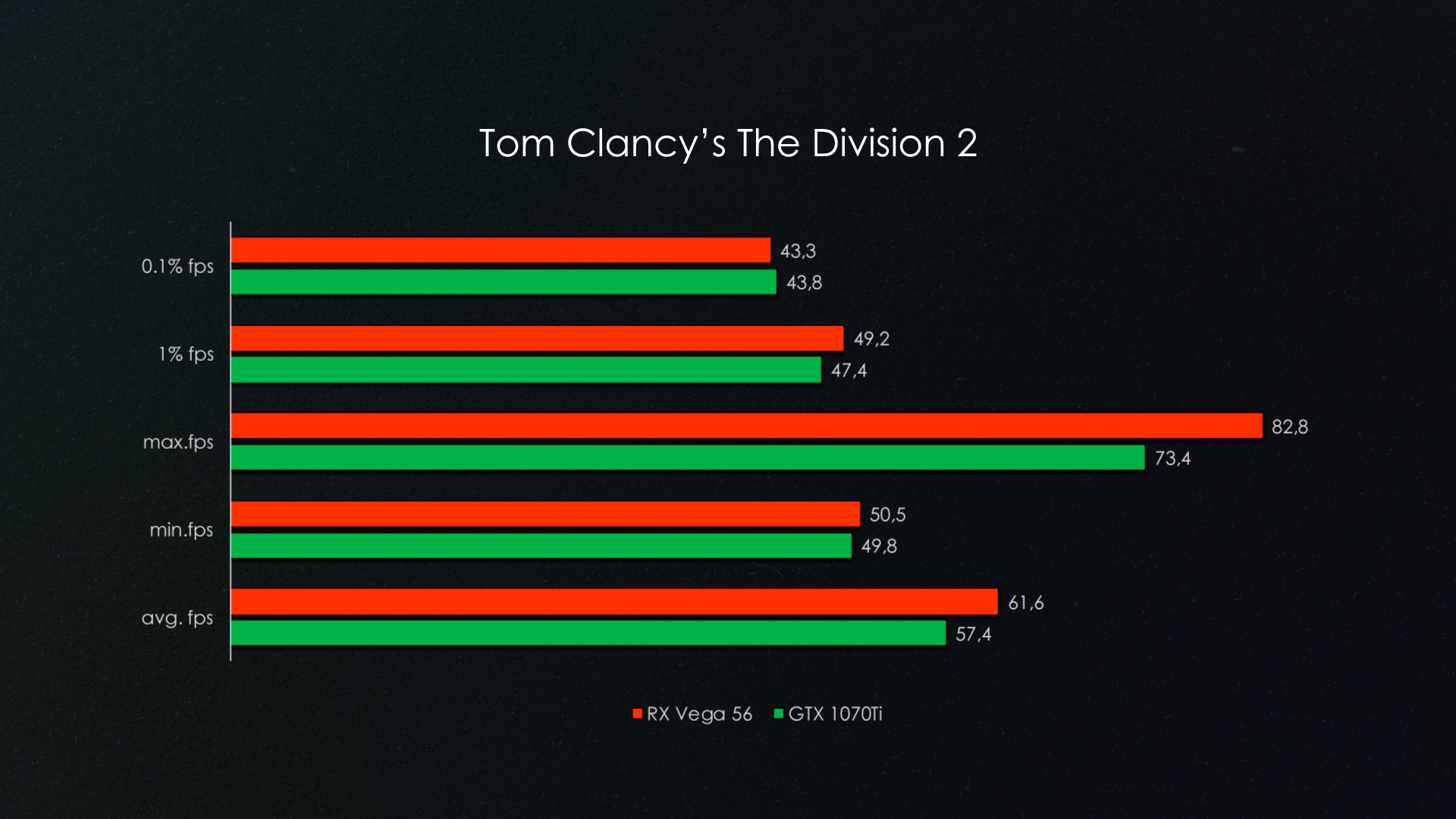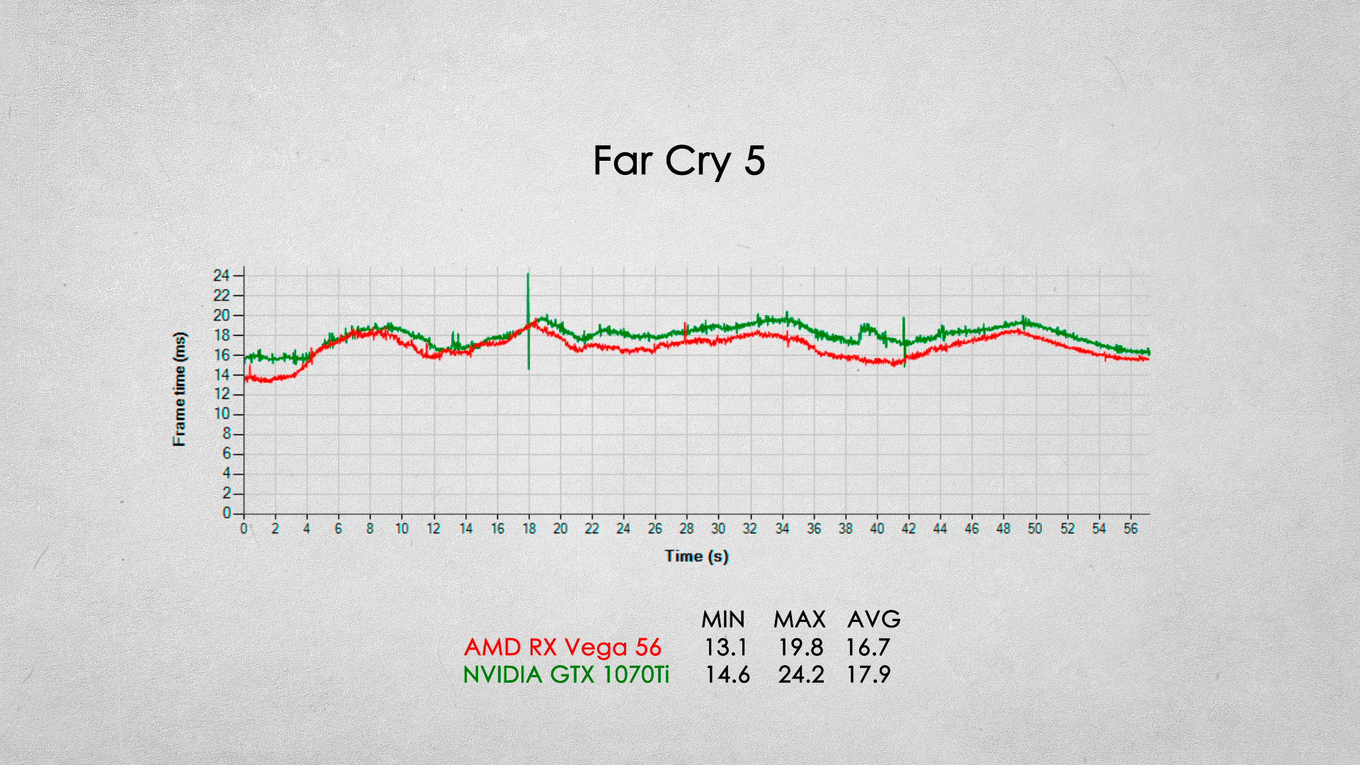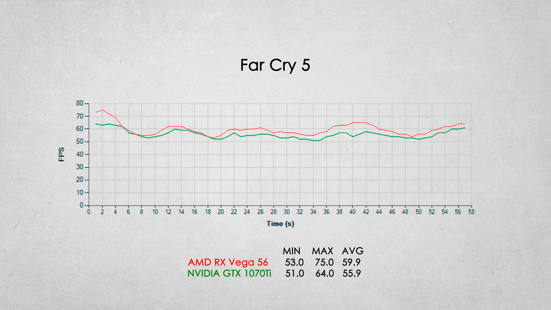 Наверное одно из самых серьезных игровых поражений видеокарты от AMD. Видеокарта GTX 1070Ti опережает соперника примерно на 20% по среднему fps.