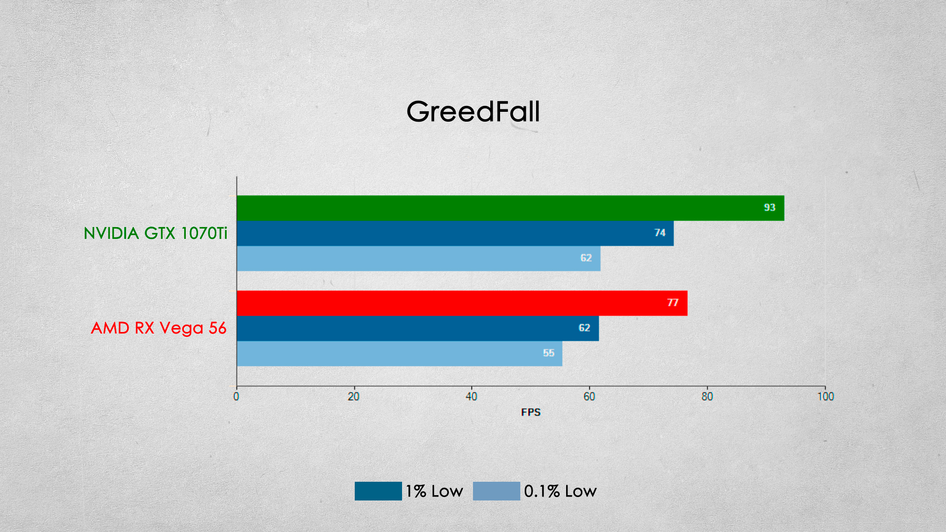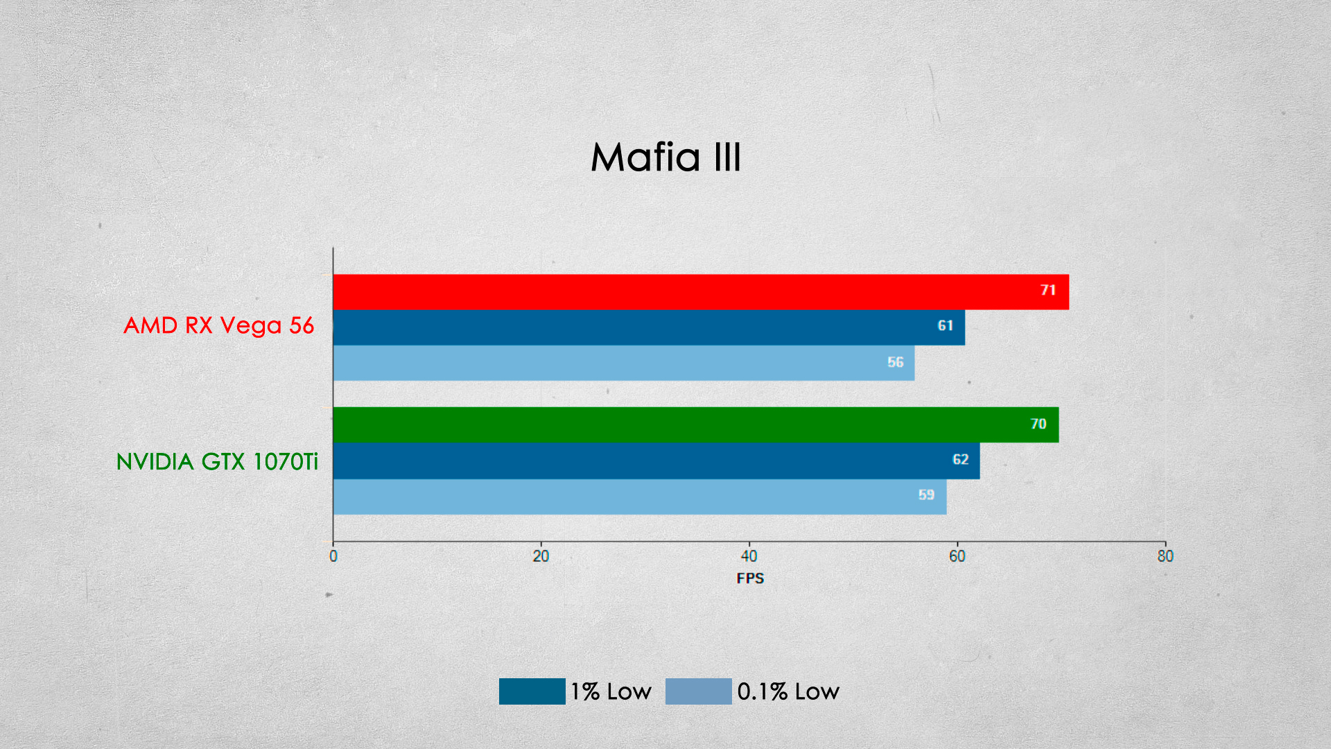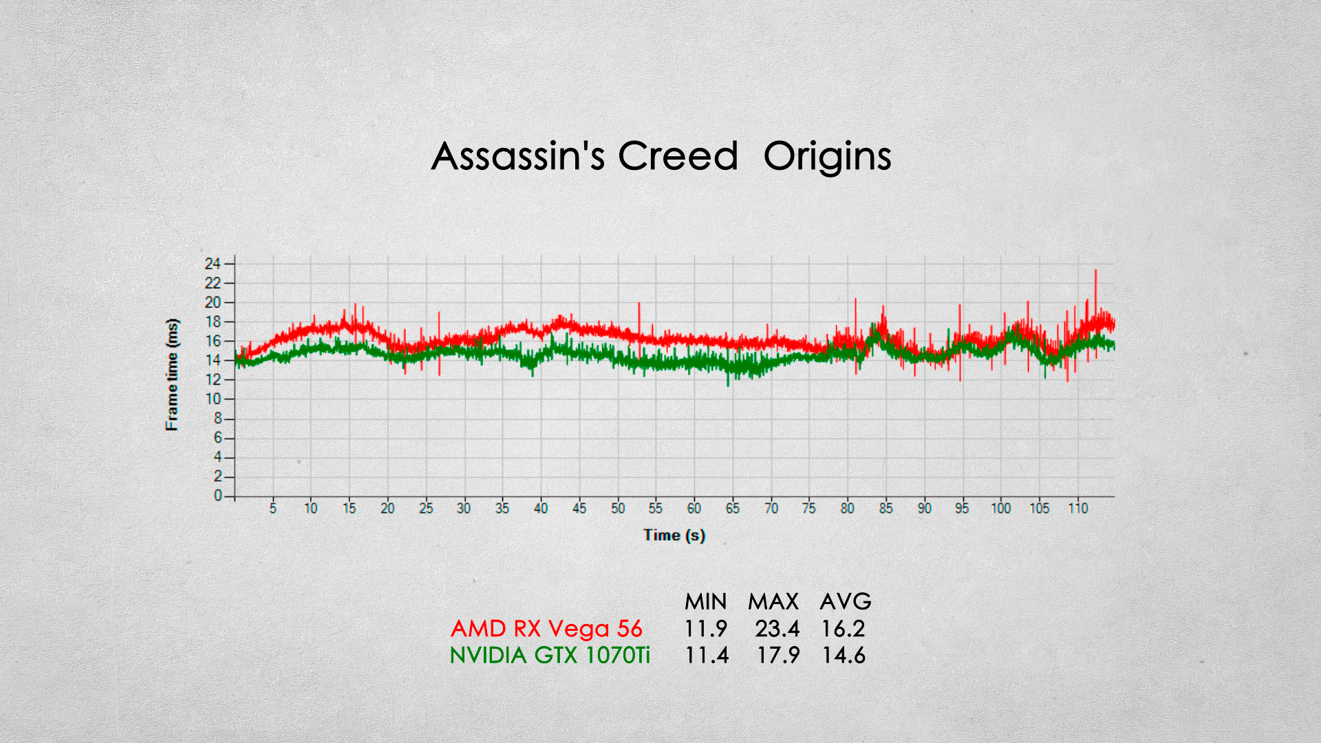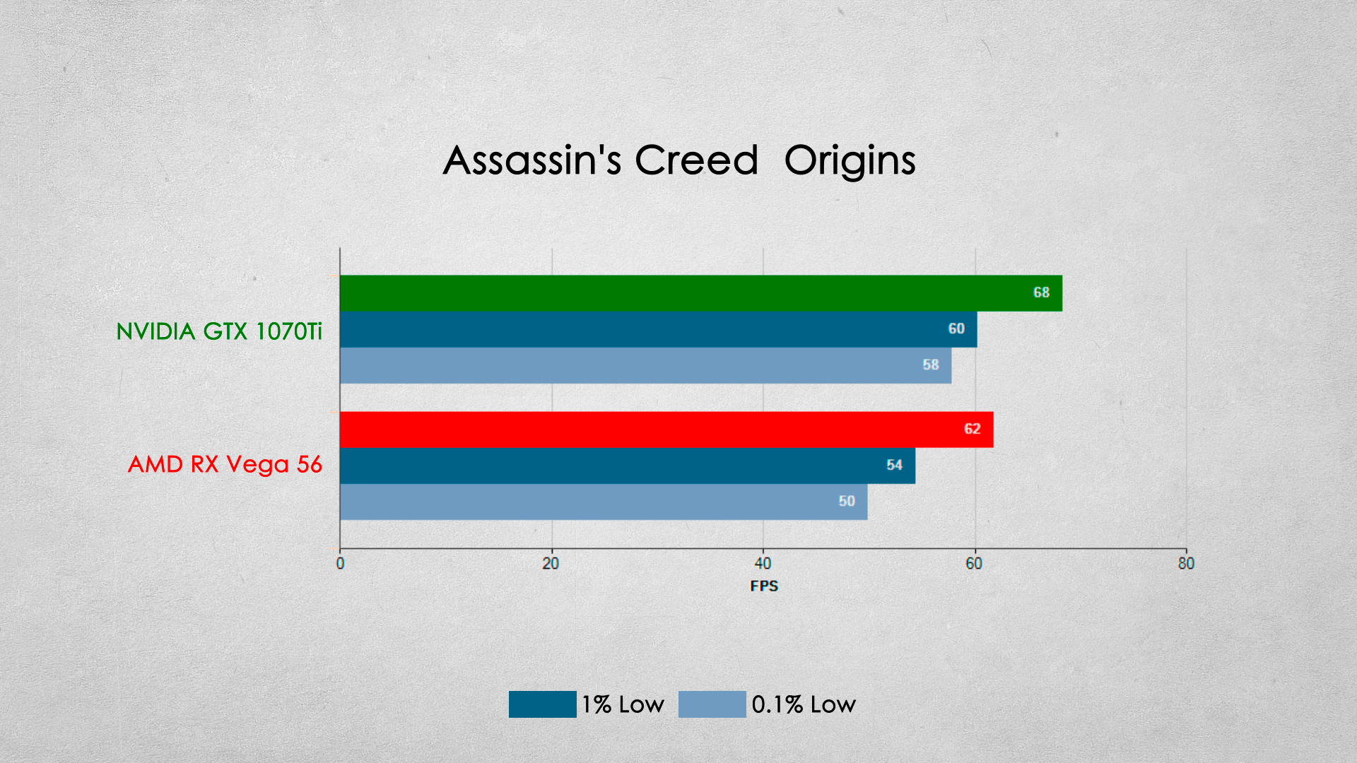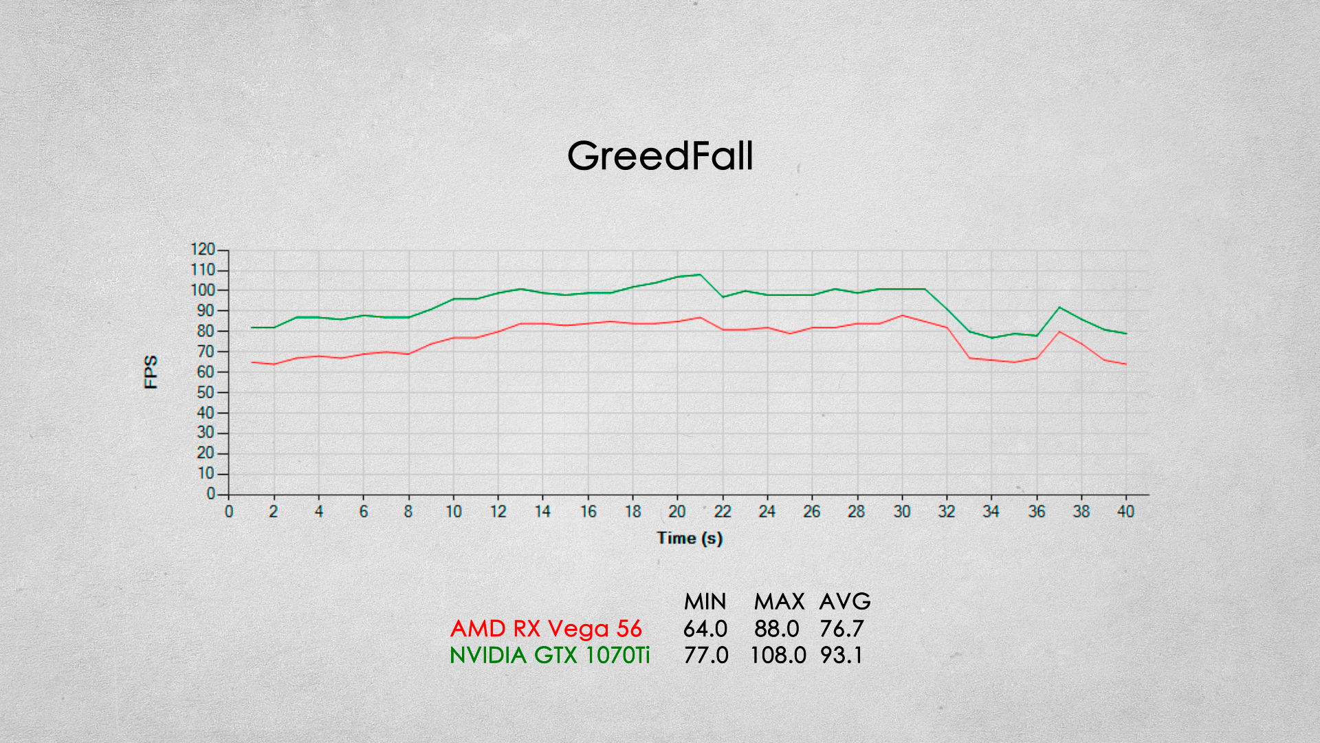 Наверное одно из самых серьезных игровых поражений видеокарты от AMD. Видеокарта GTX 1070Ti опережает соперника примерно на 20% по среднему fps.