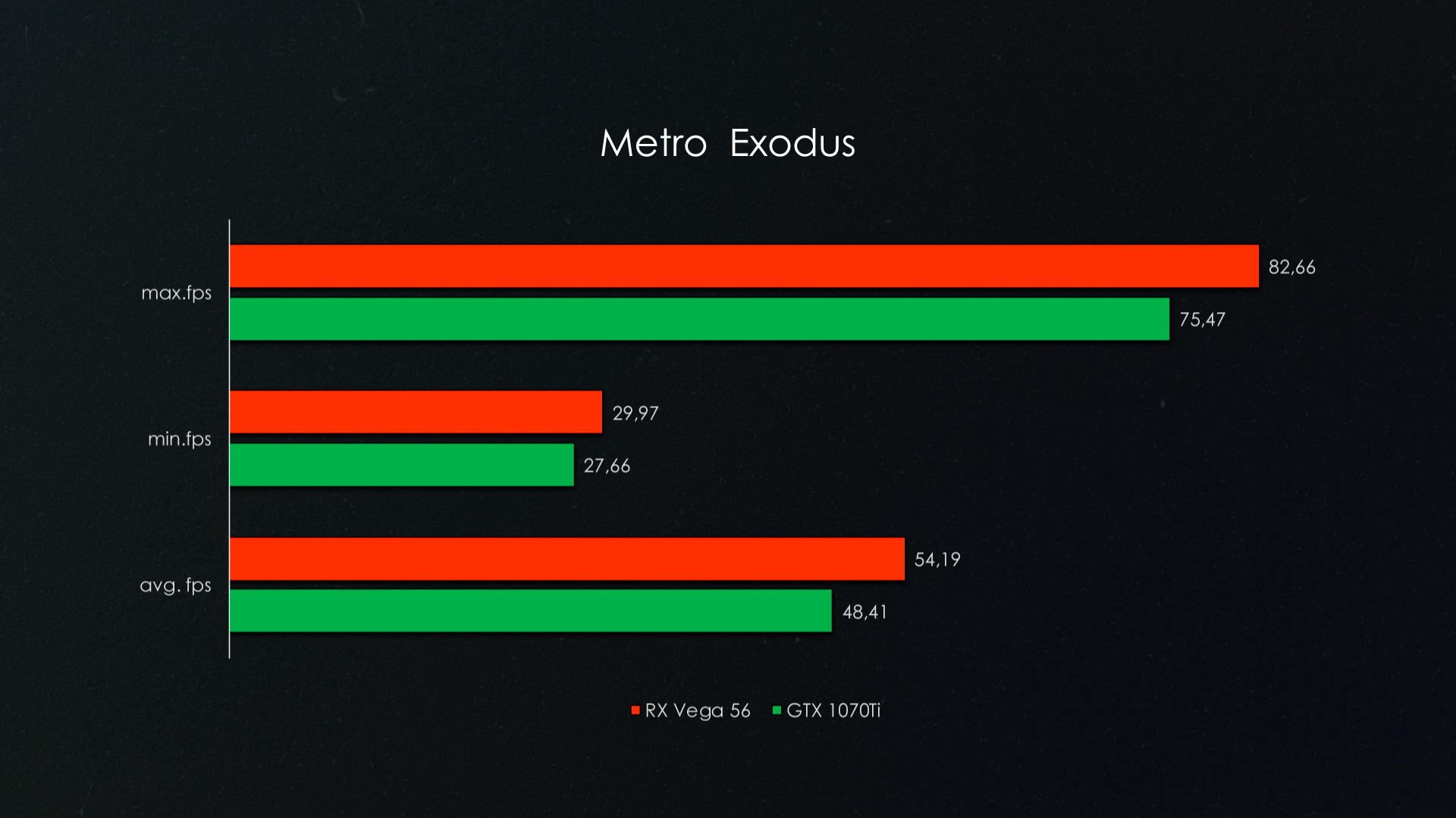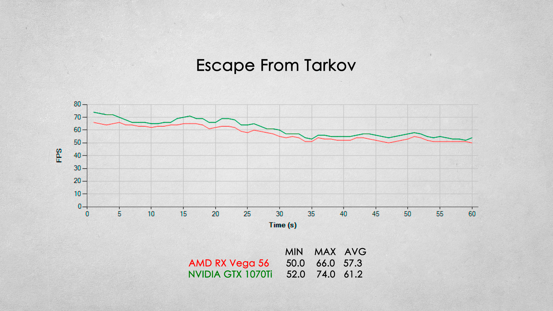 Когда в кадре туман, что-то невероятное происходит с обеими видеокартами, но Vega 56 сдает позиции намного сильнее, чем GTX 1070Ti. Однако далекие виды или вид на здания помогает видеокарте от красных выиграть по максимальному fps. Если хотите пробегать через дым с fps под 100 вам точно к хуангу.