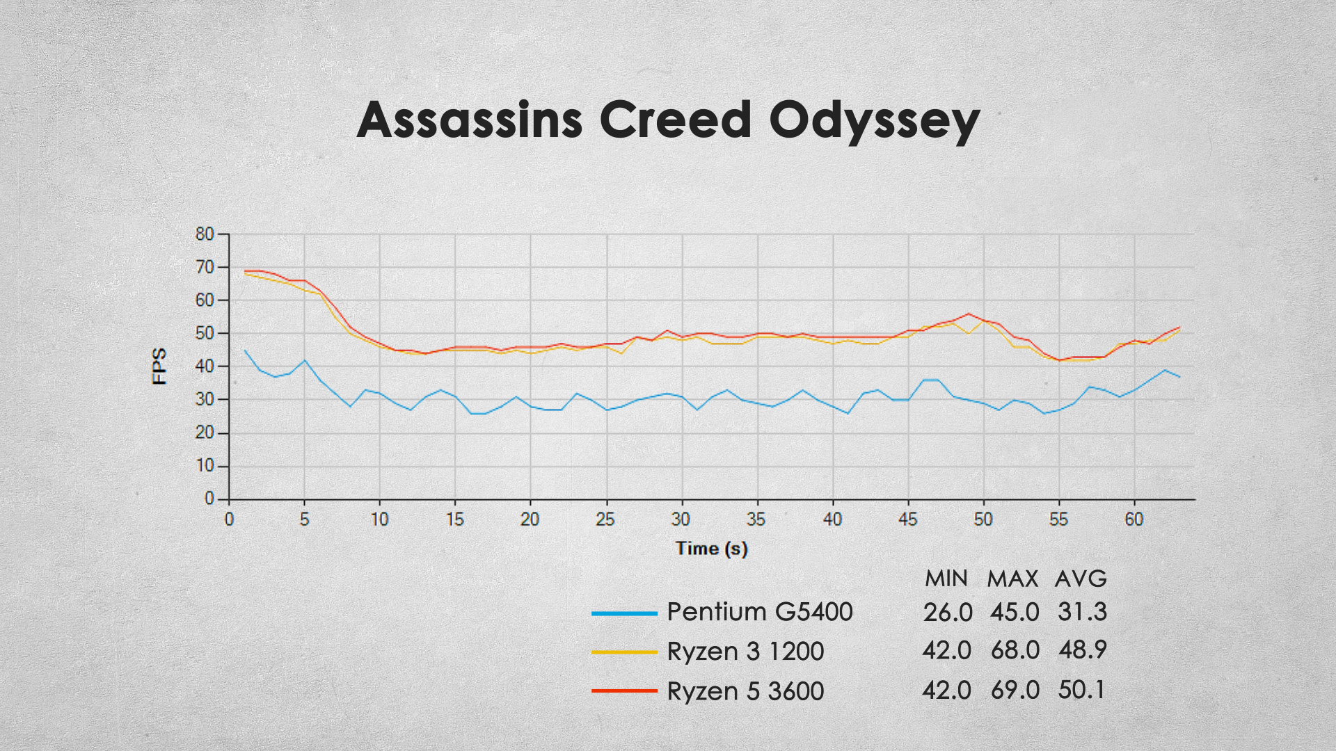 Очередное провальное поражение intel Pentium. Даже в игры пятилетней давности наблюдаются неприятные фризы и подергивания в городах. Конечно Ryzen R3 1200 тоже не идеален, но у него дела обстоят куда лучше.
