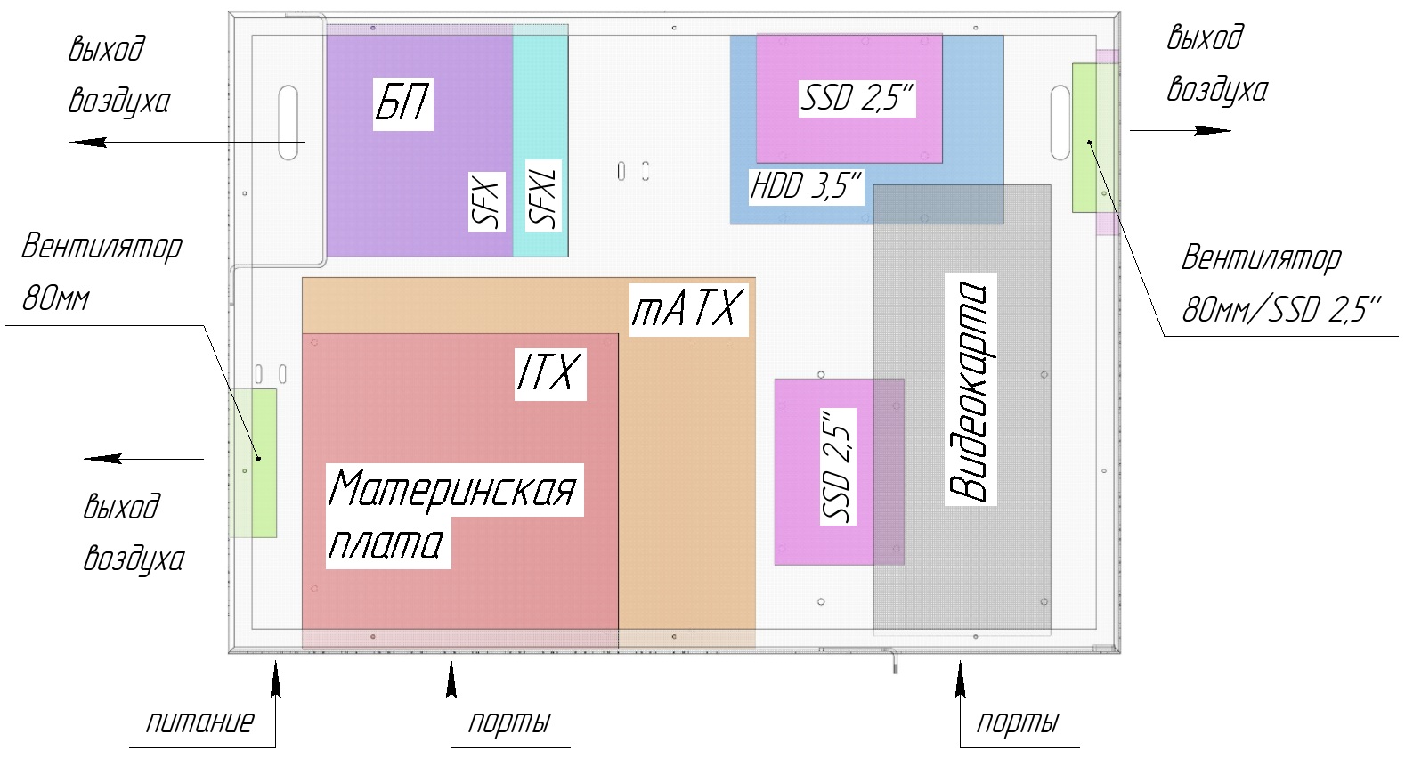 - Забор воздуха кулером процессора / видеокартой / блоком питания должен происходить через крышку корпуса.