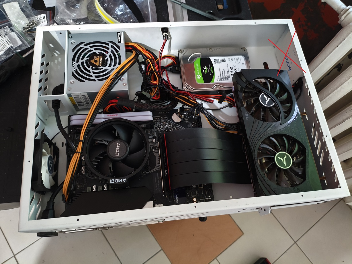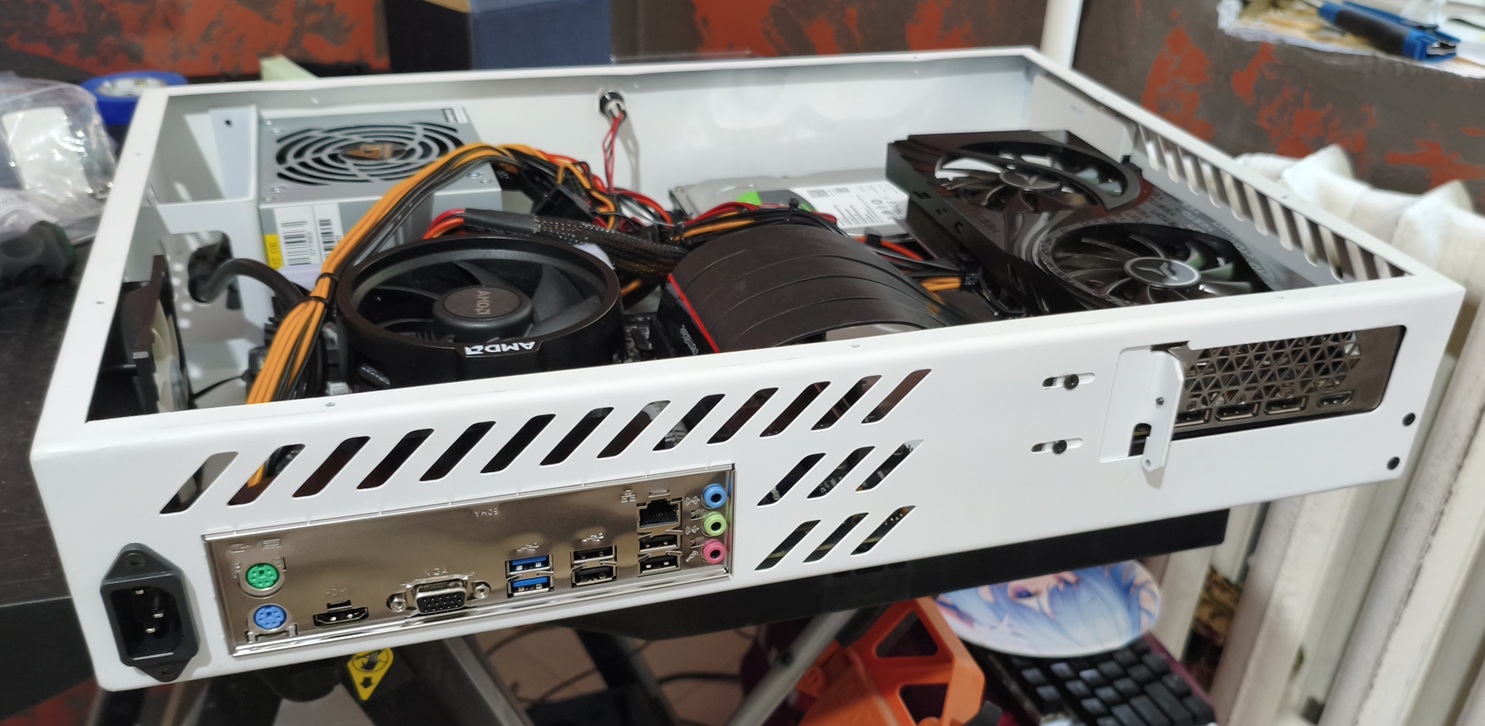 После получения готовых деталей корпуса от изготовителя настал самый важный момент, проверка на собираемость. Боялся, что не встанет заглушка материнской платы, но она встала замечательно и плотно. Сперва установил туда ryzen 5 3600 rtx 3050. Результат был хороший: всё встало как надо, только кабель питания процессора оказался впритык по длине, но не в натяг.