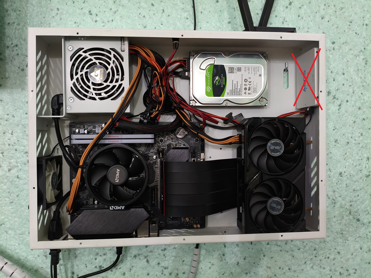 Попробовал систему в тестах, результаты по температурам мне понравились. Поиграл совсем немного, так как не было времени, делал ремонт в квартире. Потом, примерно через месяц, на ВБ увидел ASUS RX 9060 XT 8Gb по вкусной цене и решил купить. Для моего корпуса карточка интересна тем, что толщина у нее 2,5 слота, и она вошла, хотя зазор между крышкой корпуса и кожухом видеокарты остался всего пару миллиметров.