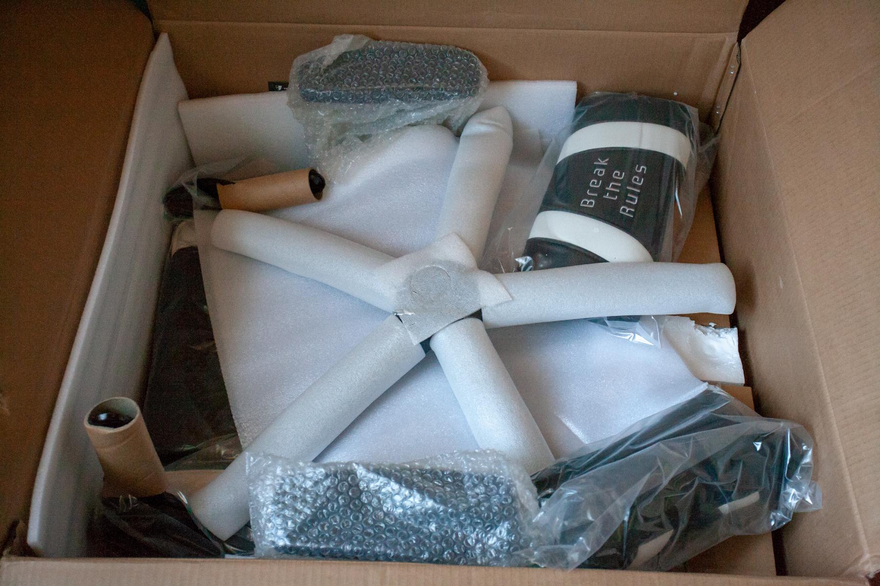Поставляется кресло в относительно небольшой упаковке из самого обычного картона. Никаких вам глянцев, изображений, советов, лишь имя производителя, номер модели, вес и размеры. А глянец не помешал бы, ему явно досталось бы меньше при транспортировке.