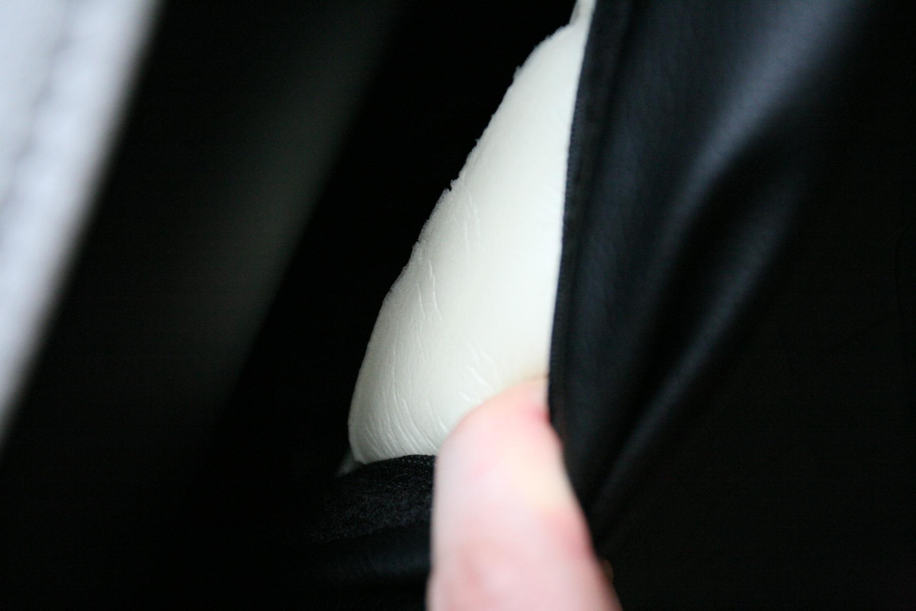 Спинка совсем не плоская, центральную часть можно оттянуть для закрепления поясничной подушки, ну и для любопытства, конечно. Под ней прощупываются эластичные стропы, а если расстегнуть липучку на правой ее стороне, можно нащупать наполнитель, который очень похож на вспененный пенополиуретан. Не поролон.