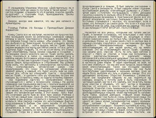 Однако в прессе и тв информация довольно однобокая, только и слышишь, как Мэнсон изнасиловал свого гитариста, принес на сатанинской мессе очередную человеческую жертву, вскрыл себе вены и всякое такое. И тут, совершенно случайно, когда совсем не ждешь, Говинда посылает автобиографическую книгу Мэрилина Мэнсона. Прочитал, обдумал. Что здесь сказать, как и основная масса книг про себя, написанная "звездами", какой-либо художественной ценности этот мемуар не представляет. Но читать всё равно интересно, в некоторой степени это открывает внутренний мир этого действительно странного человека. И нельзя, судя по книге сказать, что он полнейший отморозок, каким видится многим, кто знаком с ним лишь по газетным публикациям. Я был полностью уверен, что Мэнсон педераст, как минимум пассивный, но он себя таковым не считает в полной мере. Он даже разработал свод правил, по которым можно ориентироваться, голубой ты или нет. Я когда в первый раз читал, чуть со смеху не упал