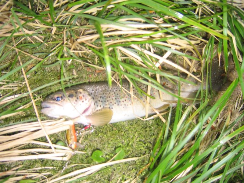 Вот опять был на рыбалке сегодня, на той-же речке. У нас тут дожди были и целую неделю вода была высокая... А на етой речушке, как впрочем и на других горных, ето выглядит угрожающе... Бурный белый поток... Ну так вот =) А позавчера показалось солнышко и тучи пошли в на. Вода упала и вот в четыре часа вечера я стою на берегу... Вода ещё мутновата...Значит надо приманку поярче, ну а впрочем... Единственной реально работающей на етой речке приманкой у меня оказались воблеры АбуГарсия серии TroutTormentor. Покупал их два комплекта (в одном 3 штуки), один загнал другу в Приднестровии как подарок. Ну не представлял я тогда как ловить на такое. Кстати в упаковке были 2 Торментора и один неизвестный какой-то воблер. Да и настоящие были разными, по цветам =) Один красноватого оттенка а другой оливковый... И играли они по разному, красненьки поживее был... Кстати именно на него я сдесь и ловил. Но волей судеб он остался на дне...А оливковый остался у меня в коробочке =) Как правильно говорят что-б приманка работала надо в неё верить (а ещё умываться водой из реки или хотя-б руки мыть, а как только на рыбалку приходишь сигаретку скурить, и ещё максимально аккуратно выпускать мелочь - речку не настраивать против себя), но так как различия в игре между разноцветными братьями были заметны даже на глаз ,веры в него было немного... Как оказалось зря =) Впрочем ловит он всё равно хуже чем красненький =) Вернёмся к рыбалке... Сегодня я твёрдо решил дошагать до моего счастливого участка, каждую рыбалку на нём ловил что-нибудь, там посплавлять воблерок и потом вверх по течению с вертушкой... Другие ведь на нёё только и ловят... А у меня на неё ни поклёвки ни выхода... Ну слабость характера взяла своё... И ловить на блесну я начал идя вниз по реке... То-есть продраться сквозь бурелом к реке обловить участок насколько можно и потом через бурелом метров на 200 по течению. Пройдя около полутора километров таким способом я ничего не словил. Ну думаю та дело нас не пойдёт и достаю единственного оставшегося Торментора... Посидел покурил, подумал если и его оставлю на дне, то у лучшему, т.к буду врашалку совершенствовать. И с неочень легкой душой отрываю карабин и вяжу воблер. Приметил камешек из воды торчащий, уселся на него и довай спалавлять. Сплавлял сплавлял аж руки устали. Щутка =) На втором проплыве зацепил форельку и первый раз увидел "свечку" в исполнении пятнистой красавицы... Но красавица оказалась ещё маленькой... Всего 20 см... И от страха обделалась ручейником =) Зделав заметку в голове по етому поводу (я вот на нахлыст собираюсь пробовать, всё никак не могу найти шнур для нахлыста, думал сегодня купить, дык дед из рыболовного на пенсию ушёл, теперь придётся 100км мотать до супермаркета спортивного) отпустил её в воду... Вру, сволочь, не отпустил, потому-что передний тройник воблера впился в глаз рыбке...Стыдно.